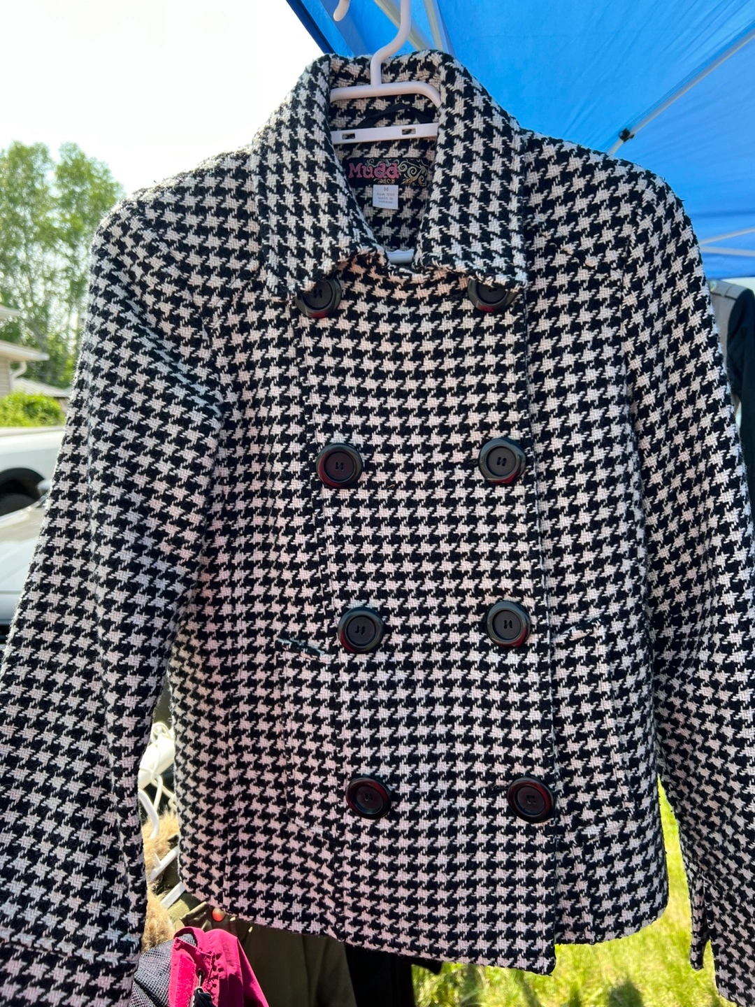 I'm selling a Mudd jacket with a black and white houndstooth pattern. The jacket features big, round buttons and a collared neckline. Layering this jacket is a great way to achieve a fashionable look.