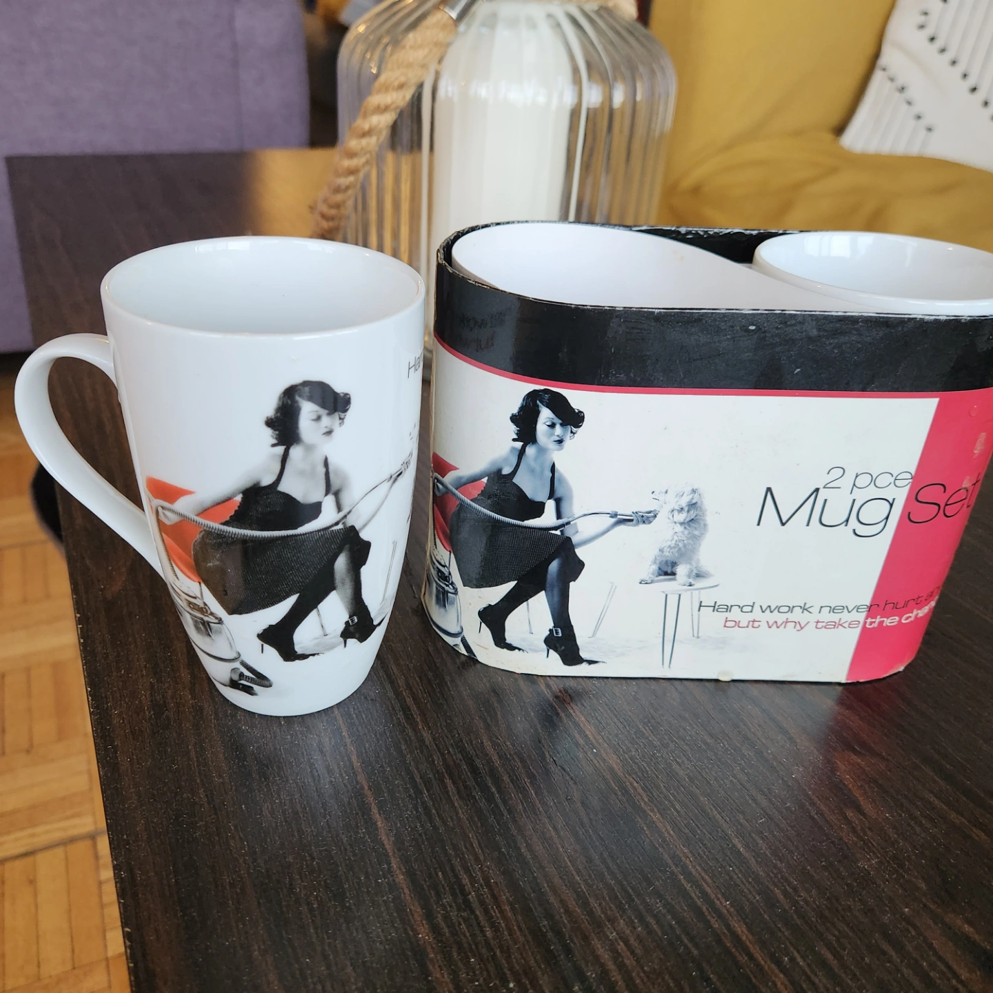 White mugs. Set of two. Illustrations of a woman, dog, and a bicycle. Also includes a matching mug-shaped box. Enjoy a hot beverage with this mug set after a long day. 2 for 5 dollars