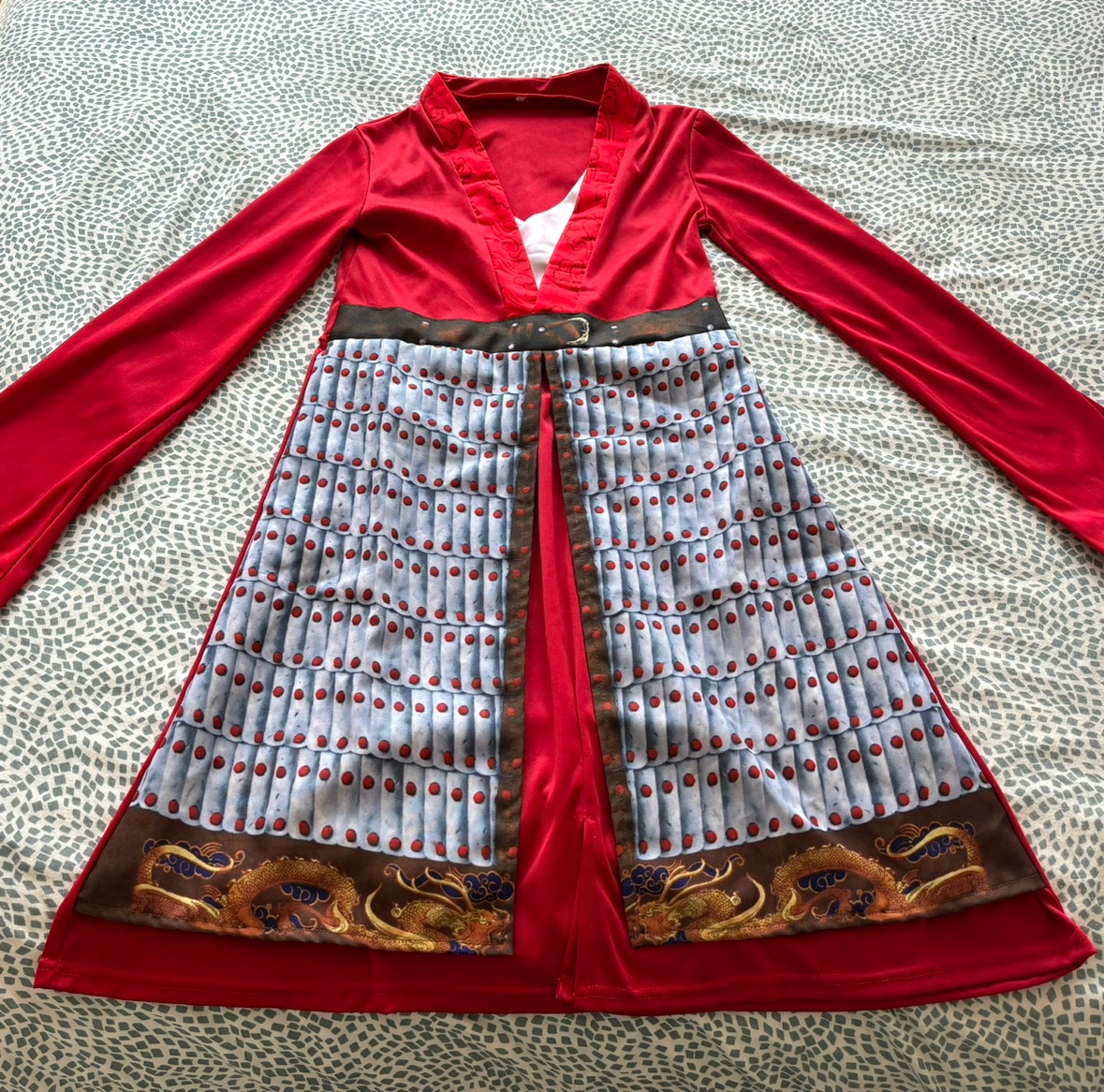 Mulan Halloween Costume, good for kid around 130cm!!😊❤️💐💐💐 Please feel free to ask for more photos or measurements, thank you!🥰🥰🤝🤝🤝