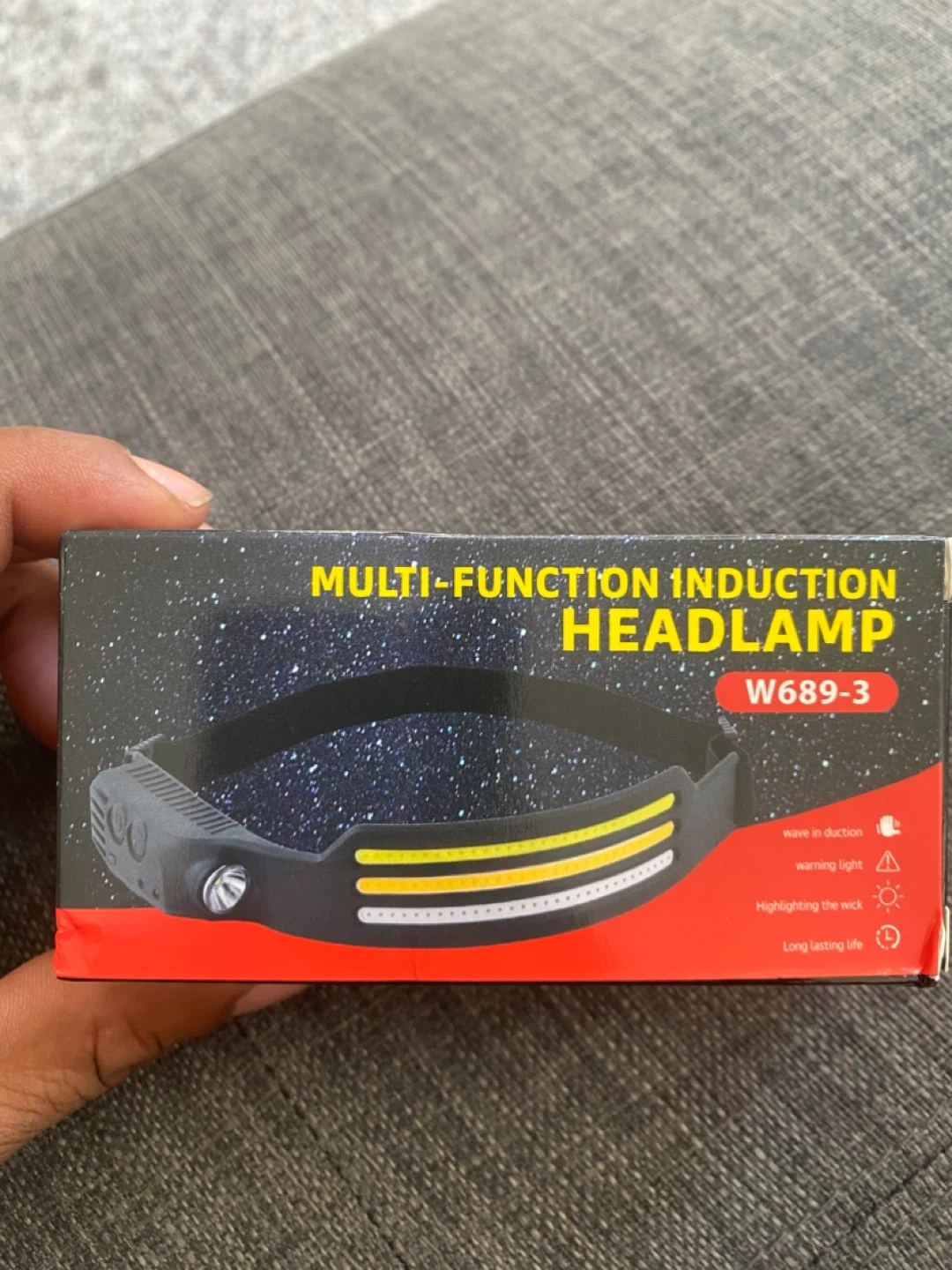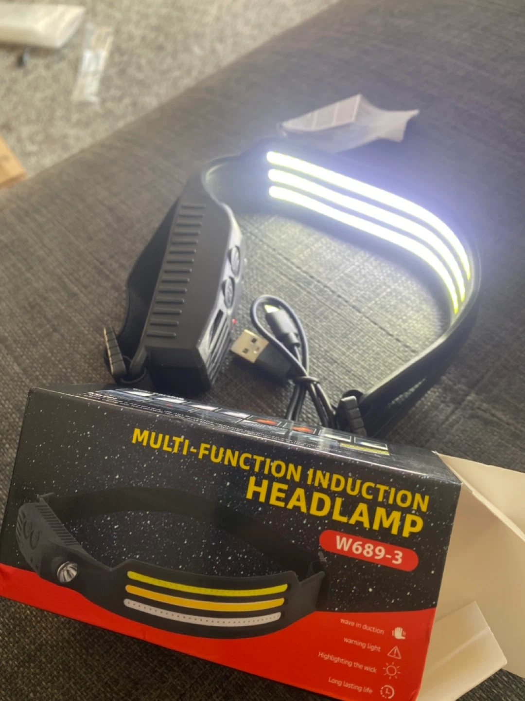 Selling a multi-function induction headlamp, model W689-3. It features wave induction, warning light, and long-lasting life. It comes with a USB charging cable and the original box