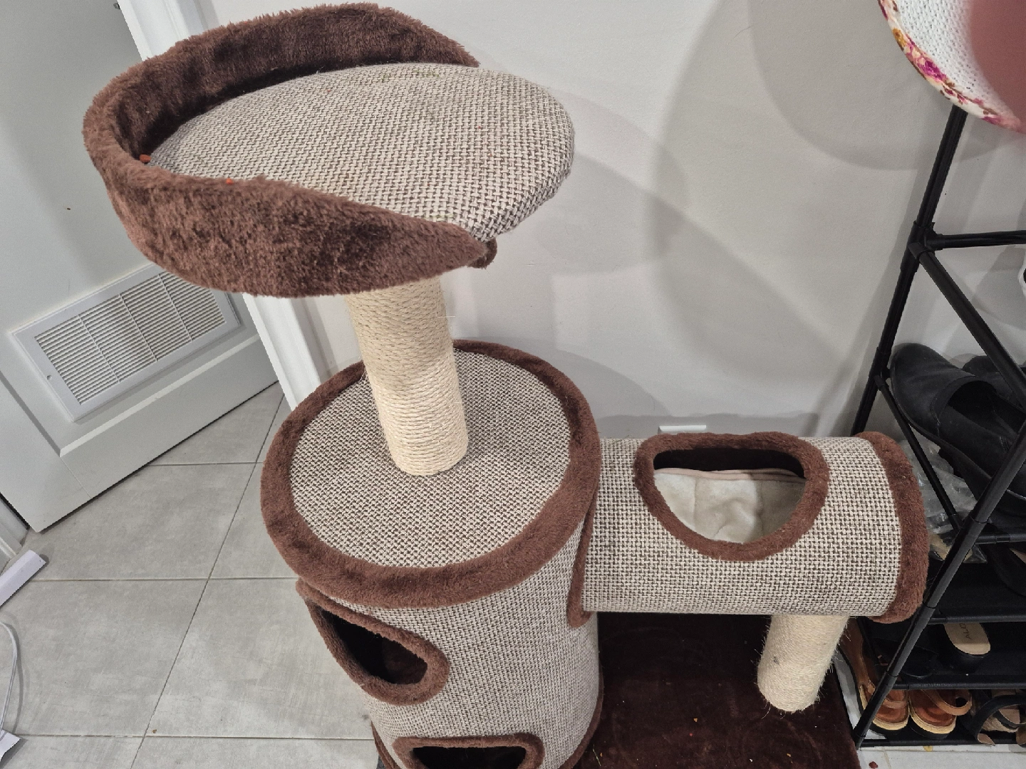 I'm selling a Catit cat water fountain. It's in great condition and ready to keep your kitty hydrated! Cat tower very little use and good condition. Bag with toys, feeder 2x and carpets.