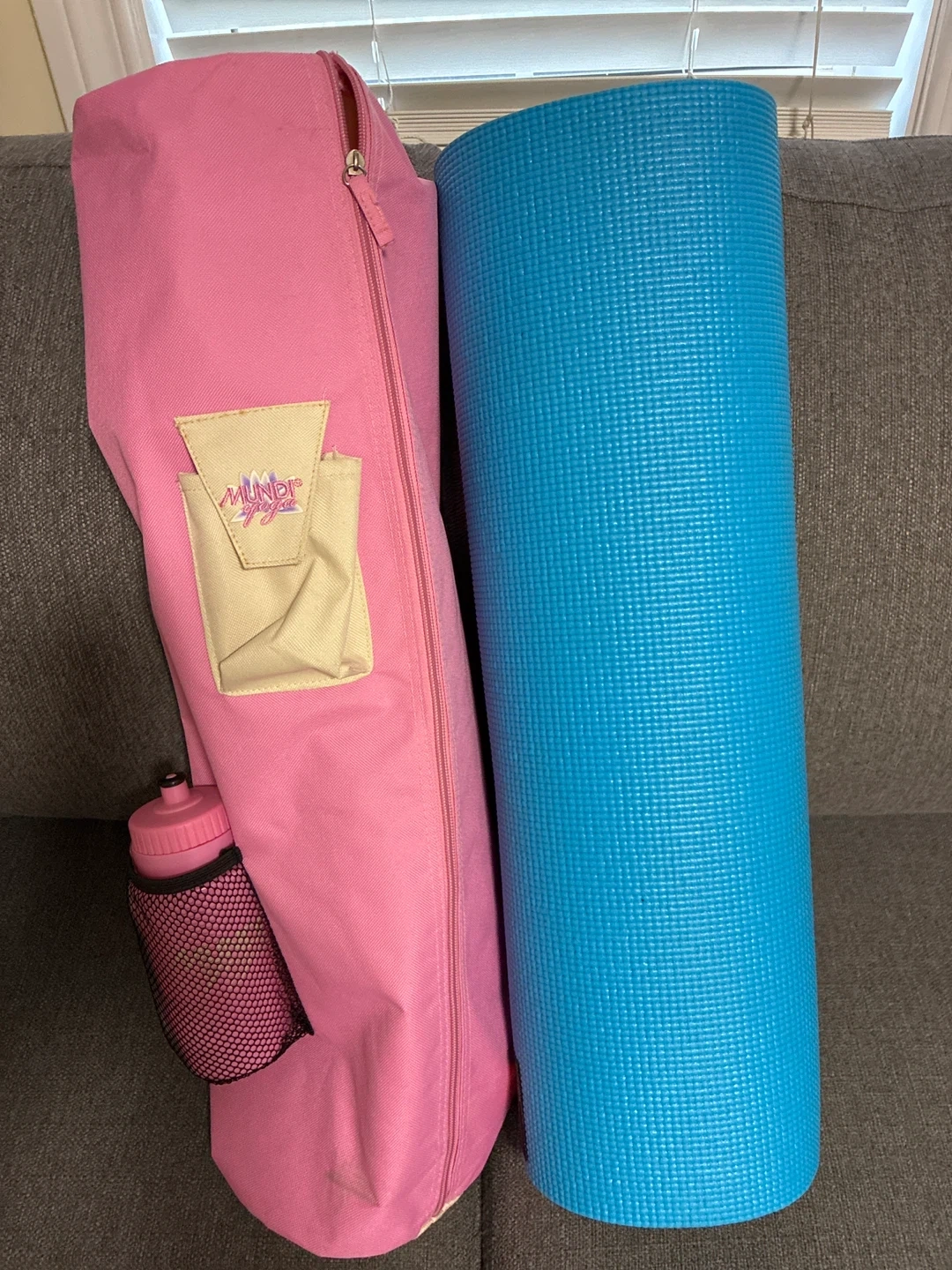 Selling a yoga set that includes a pink Mundi yoga mat bag, a blue yoga mat, and a pink water bottle. The bag is perfect for carrying your mat to and from your yoga classes, and the water bottle will keep you hydrated during your workout