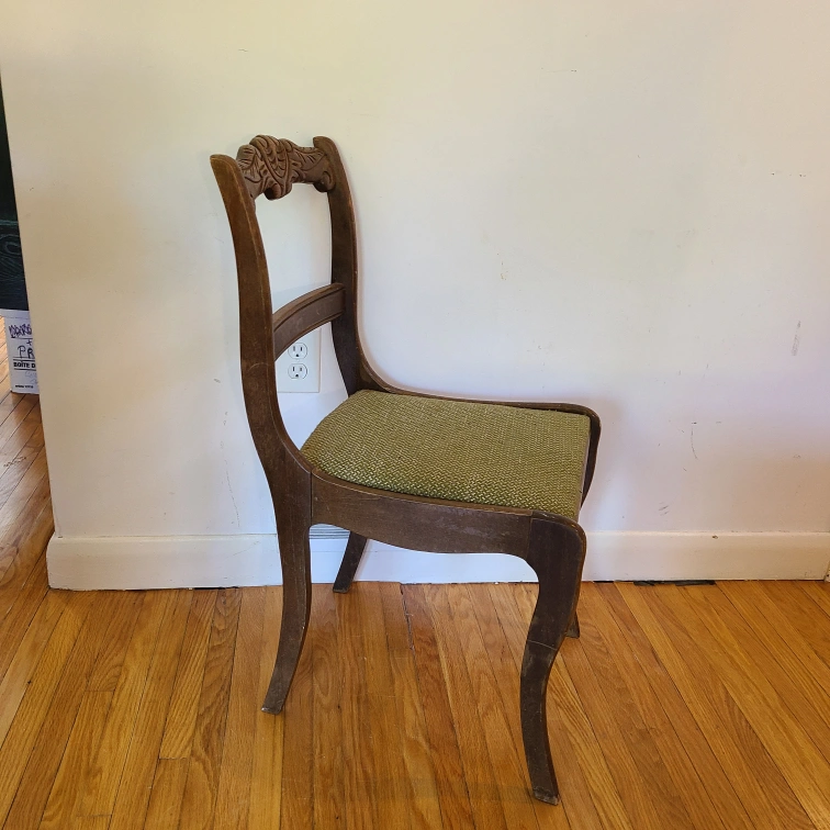 Selling a antique Murawsky Furniture Co. Limited chair from Kitchener! It has a lovely carved back and a green woven seat, with orginal fabric. Perfect as an accent piece or for everyday use! this is sturdy and in good condition! from a pet free/ smoke free home 34" back height 18" seat height 16" seat width pick up only, cash only, no holds