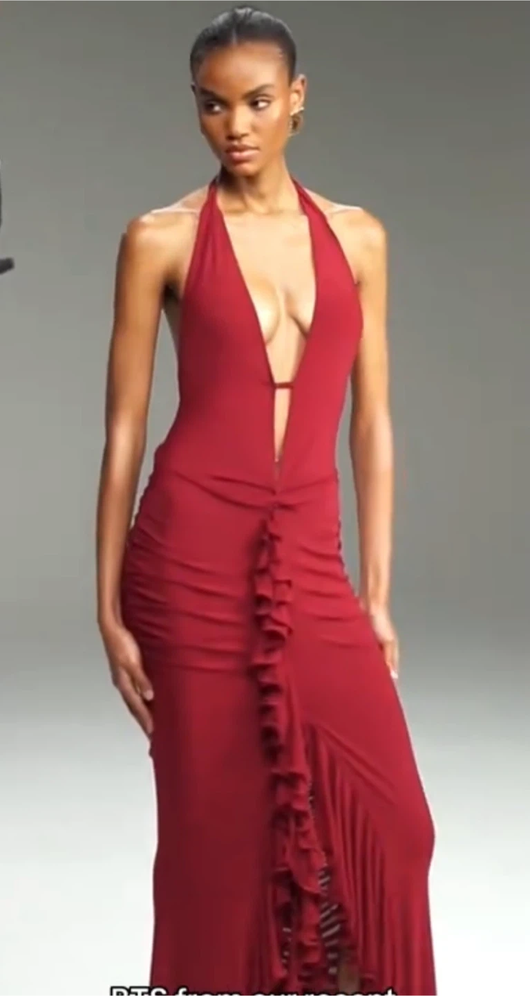 The viral Murci Rossi Dress totally sold out online and perfect for making an entrance. • Deep plunge V neckline with supportive bust bar • Elegant ruffle detailing down the front • Flattering ruching across the hips • Sleek front slit for a glam finish • Open back design for a statement look • Figure-hugging bodycon fit The ultimate party / occasion / birthday dress as seen all over TikTok and Instagram. Ideal for Christmas parties, girls’ nights out, weddings, or any event where you want to stand out. Condition: Excellent – only worn once for my birthday ✨ Size: UK 10 (true to size)