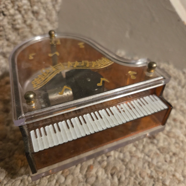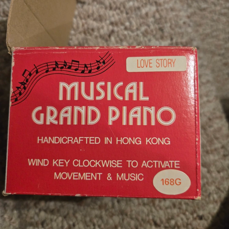 Selling a charming musical grand piano music box! This handcrafted piece from Hong Kong plays a lovely tune when you wind the key clockwise. It's a delightful addition to any collection or a sweet gift for a music lover