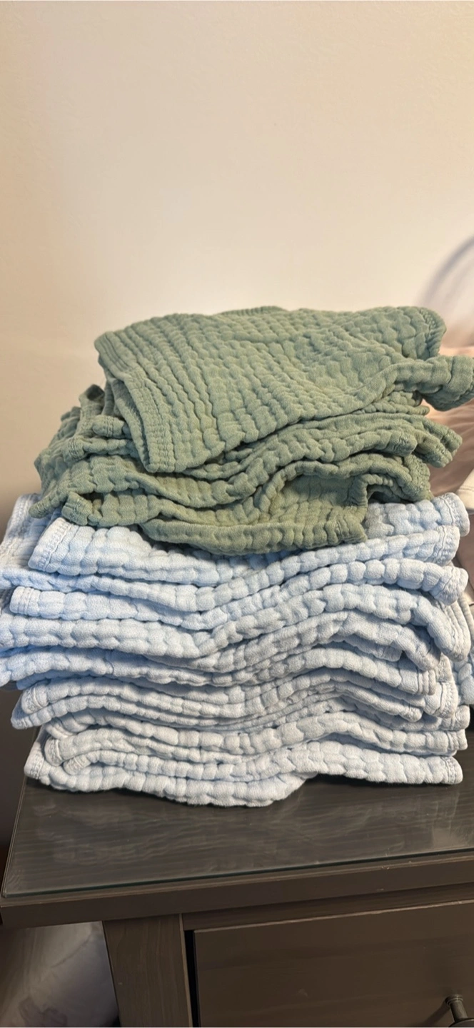 Selling a stack of baby burpcloths in light blue and green. They appear to be made of muslin fabric, perfect for gentle baby skin.