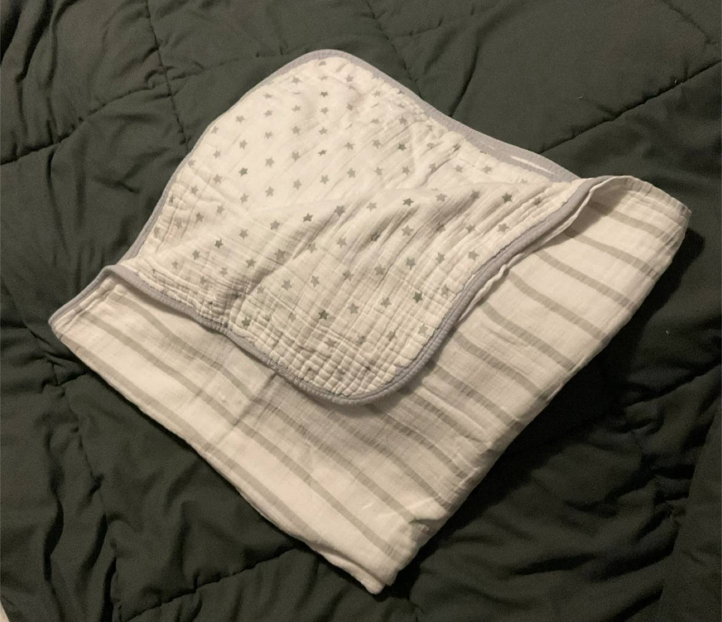 Selling a soft muslin blanket featuring a cute stars and stripes pattern! It's in great condition and perfect for keeping your little one cozy.