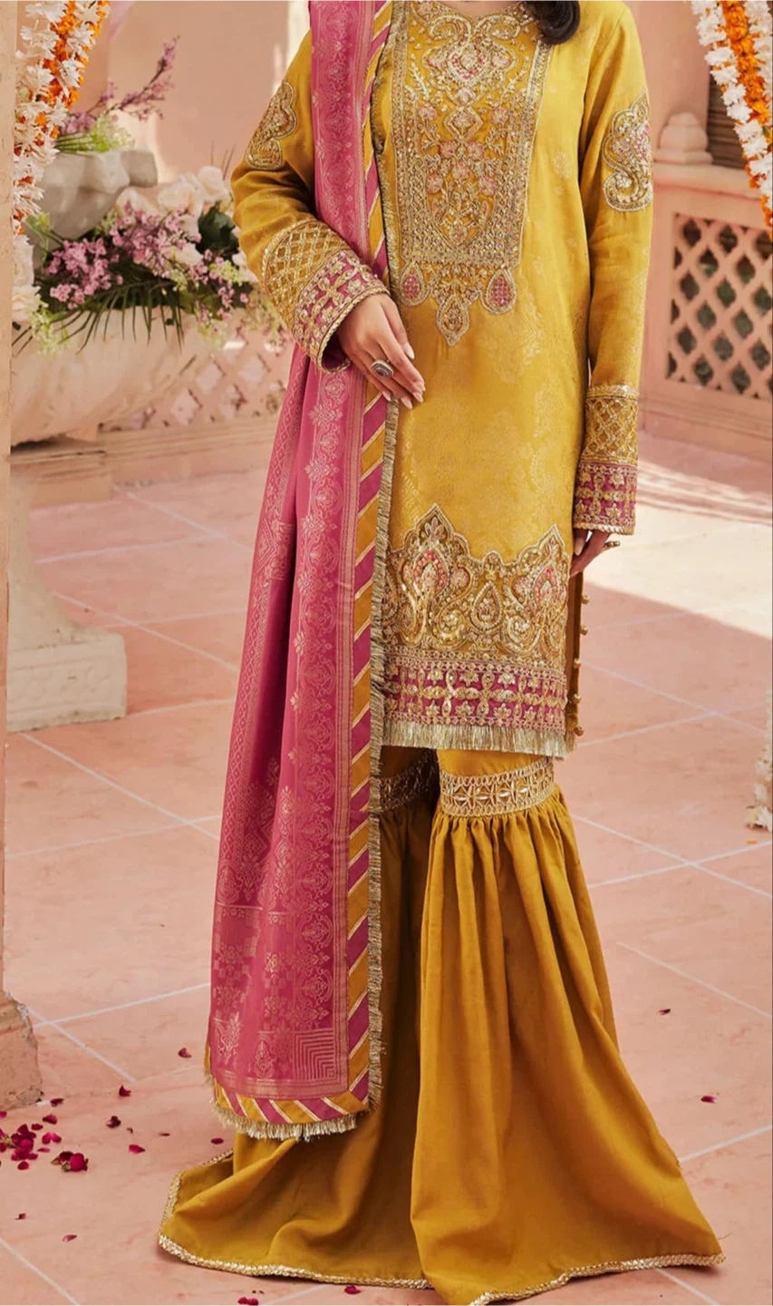 Beautiful mustard yellow sharara suit with intricate embroidery. The set includes a kurta, sharara pants, and a dupatta. Perfect for special occasions or festive wear!
