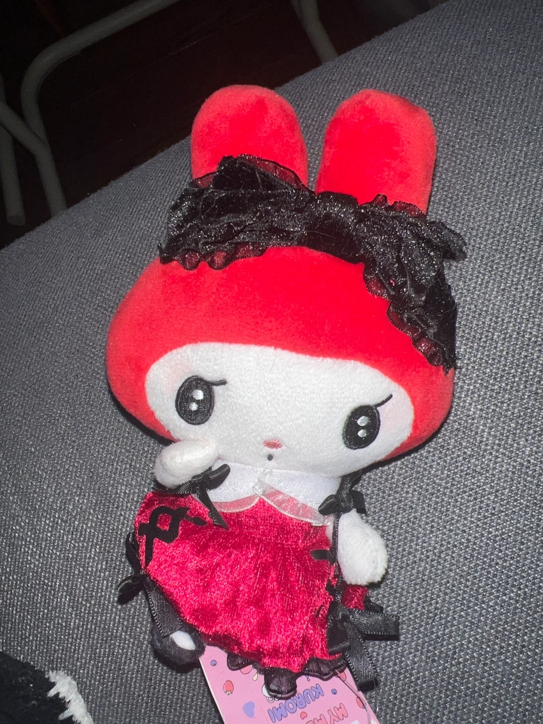 Selling a cute My Melody Kuromi plush doll! It's in great condition and ready for a new home. The plush is red and white with black lace details. It's a super adorable addition to any collection!