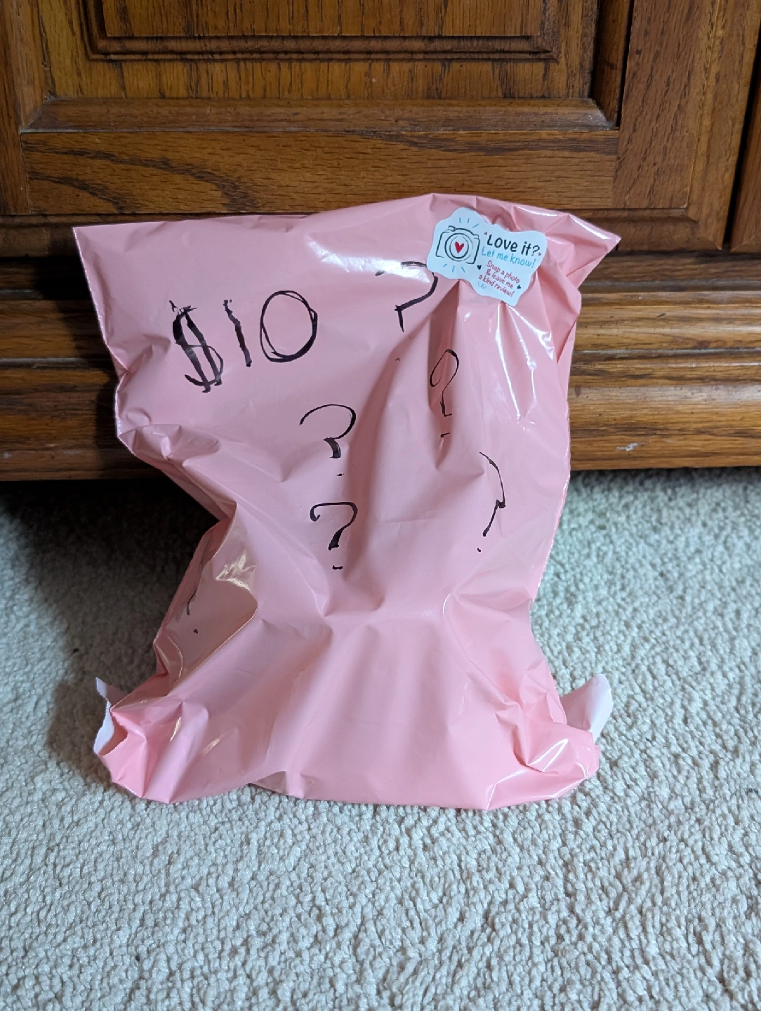 A pink package with Hello Kitty themed designs! It has question marks all over it (mystery package) worth 10$ items worth up to 20$ (maybe more) 😉