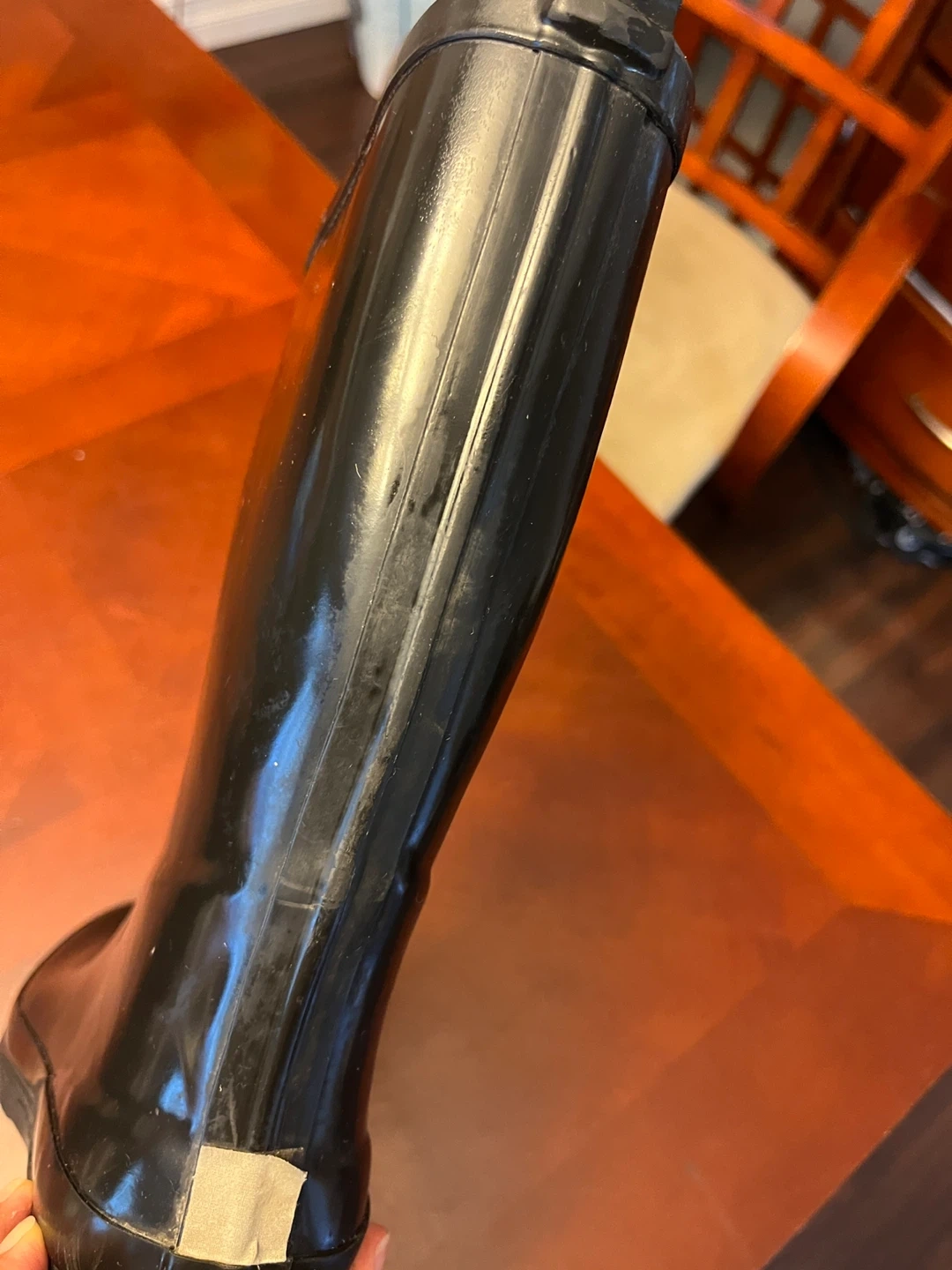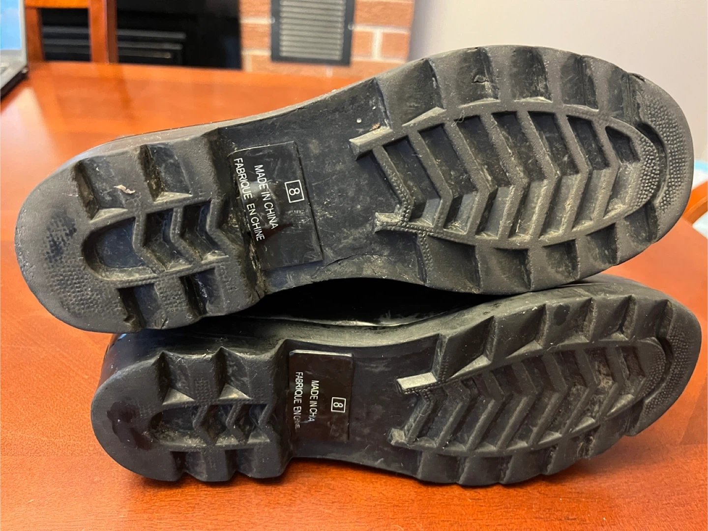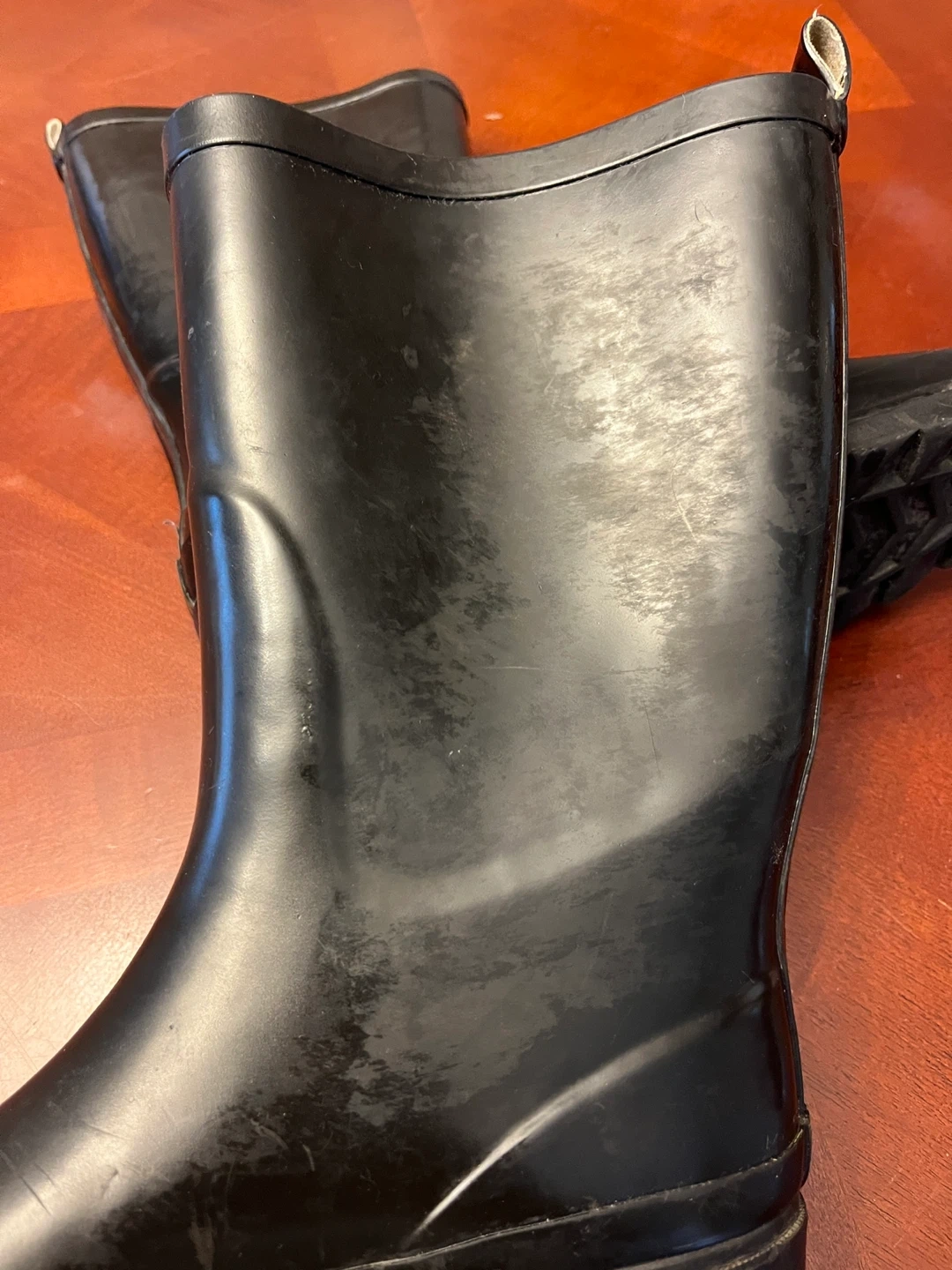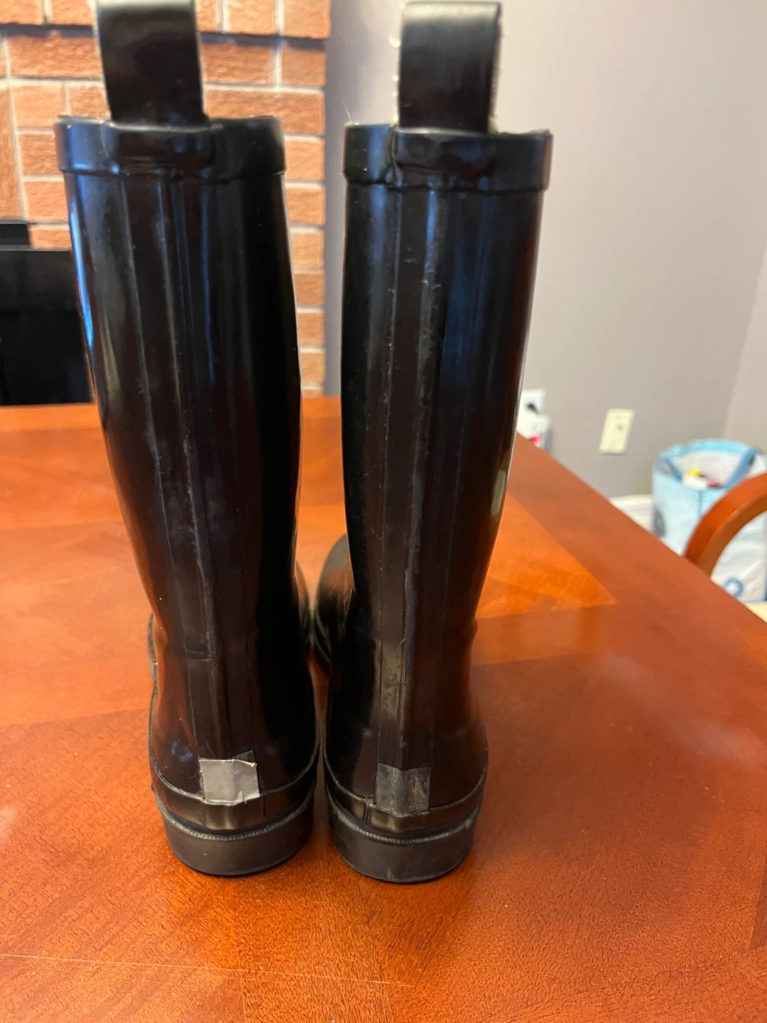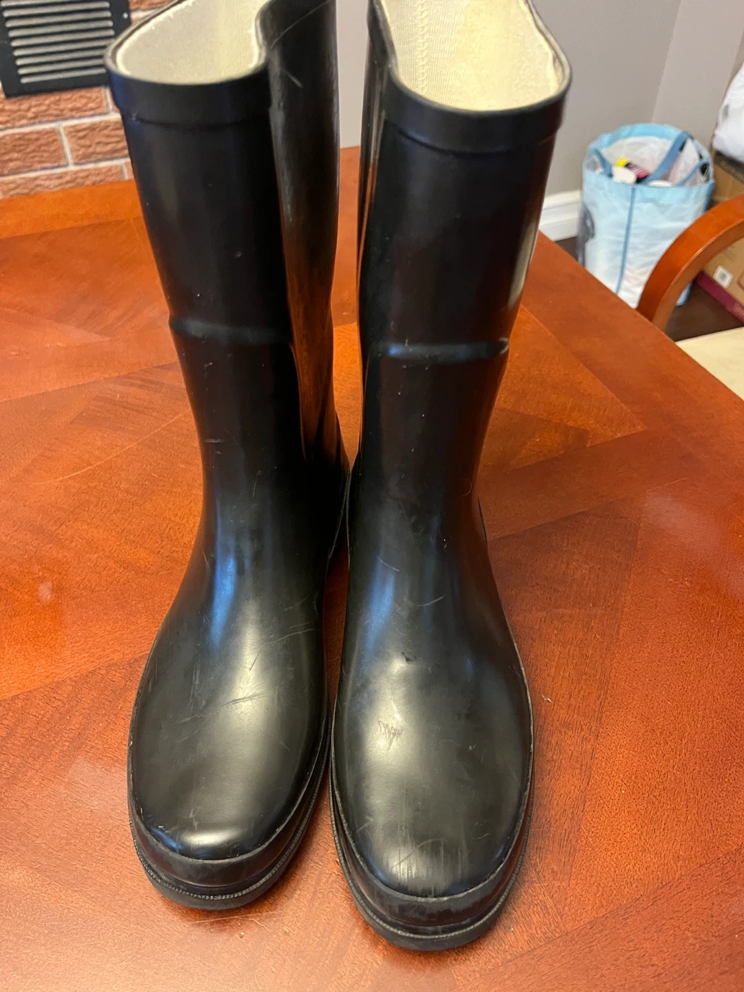 Women’s black rubber rain boots from MyStyle, size 8. Waterproof, easy to slip on with pull tabs. Condition: Excellent overall, worn just a few times. Gloss dulled in places. One decorative sticker missing at back, lining above insole loose in spots (easily glued). No holes. Pickup in Oshawa - Harmony/Rossland area