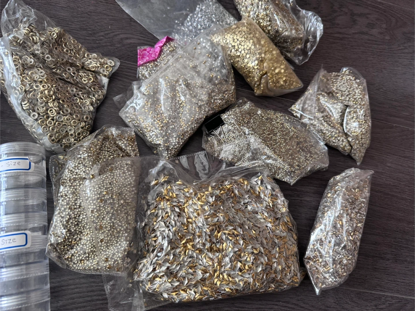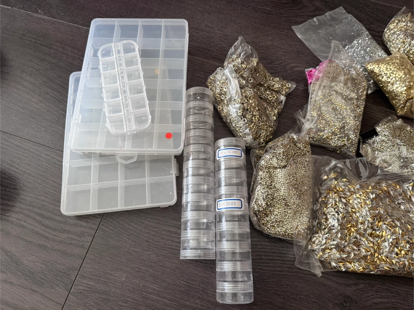 Selling a collection of craft beads in various sizes and finishes, along with clear plastic storage containers. Great for DIY projects and organizing your craft supplies!
