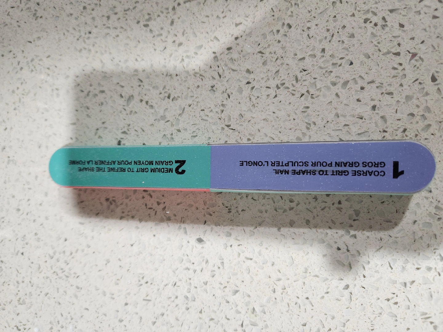 Nail file with two different grits: coarse to shape the nail and medium to refine the shape