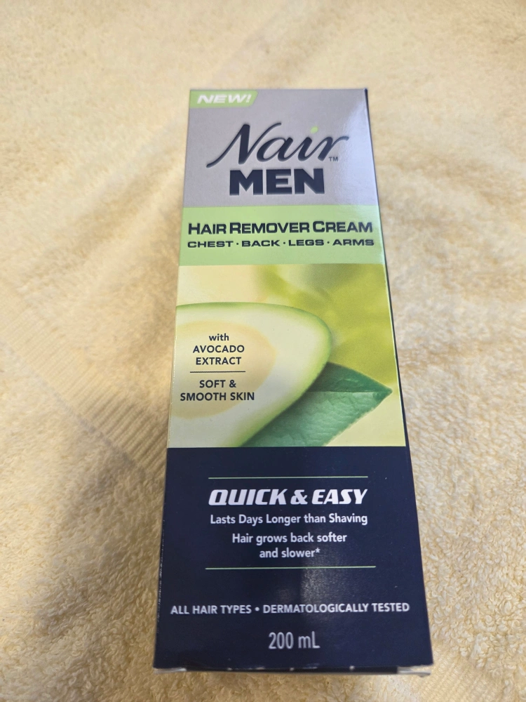 Nair Men Hair Remover Cream for chest, back, legs, and arms. It's quick and easy to use and lasts days longer than shaving. The cream contains avocado extract for soft and smooth skin. Dermatologically tested and suitable for all hair types. Size is 200 mL