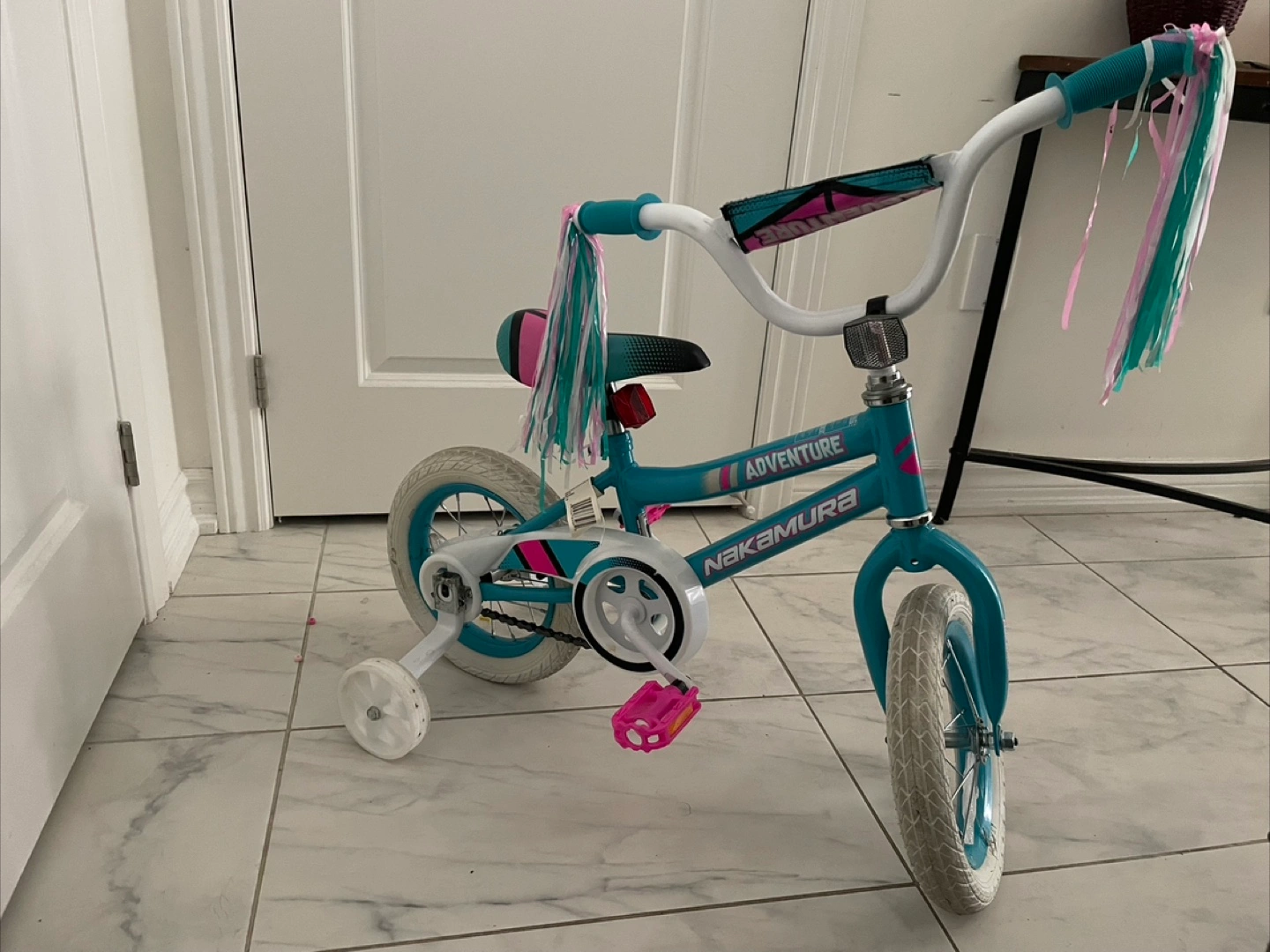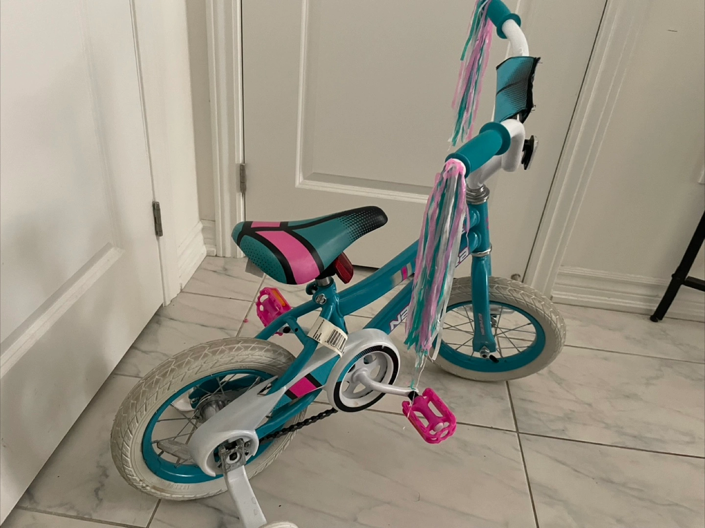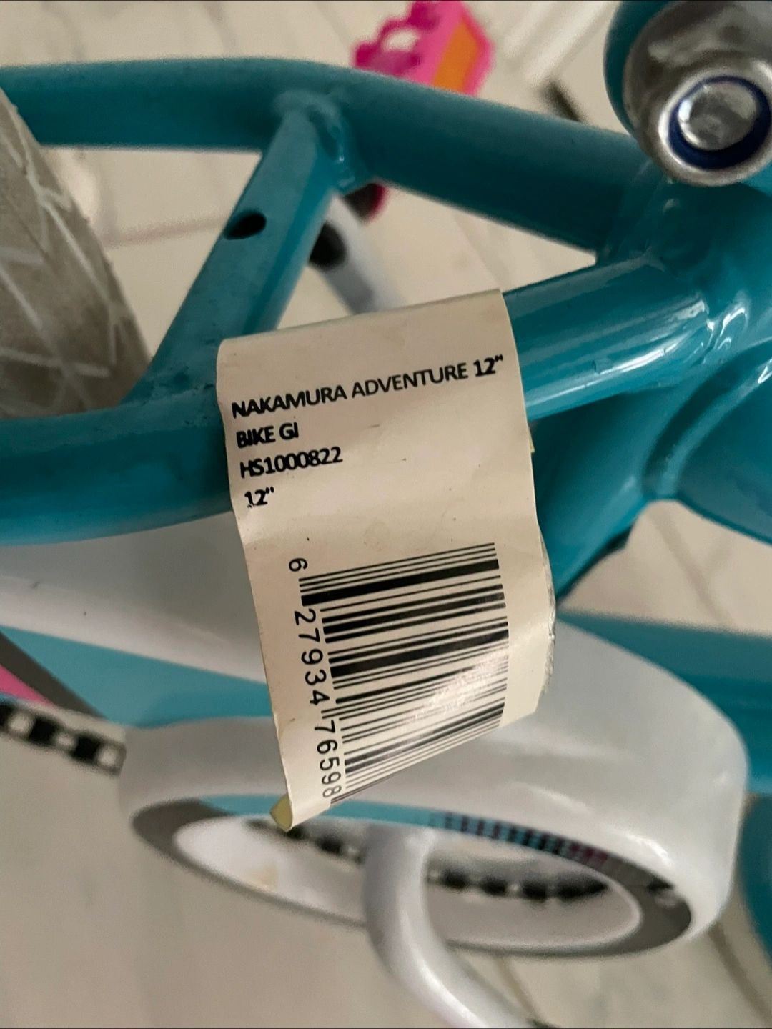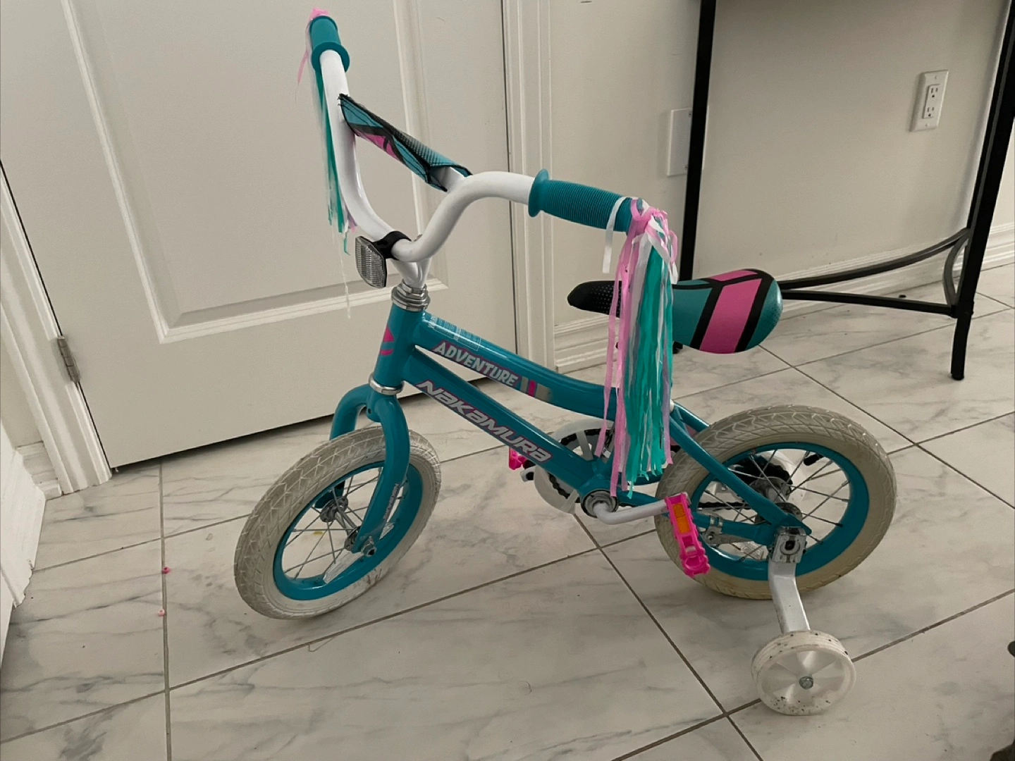 Selling a Nakamura Adventure 12" kids bike! It's in good used condition and ready for a new rider. Perfect for learning to ride, with training wheels included. The bike is a fun teal colour with pink accents.