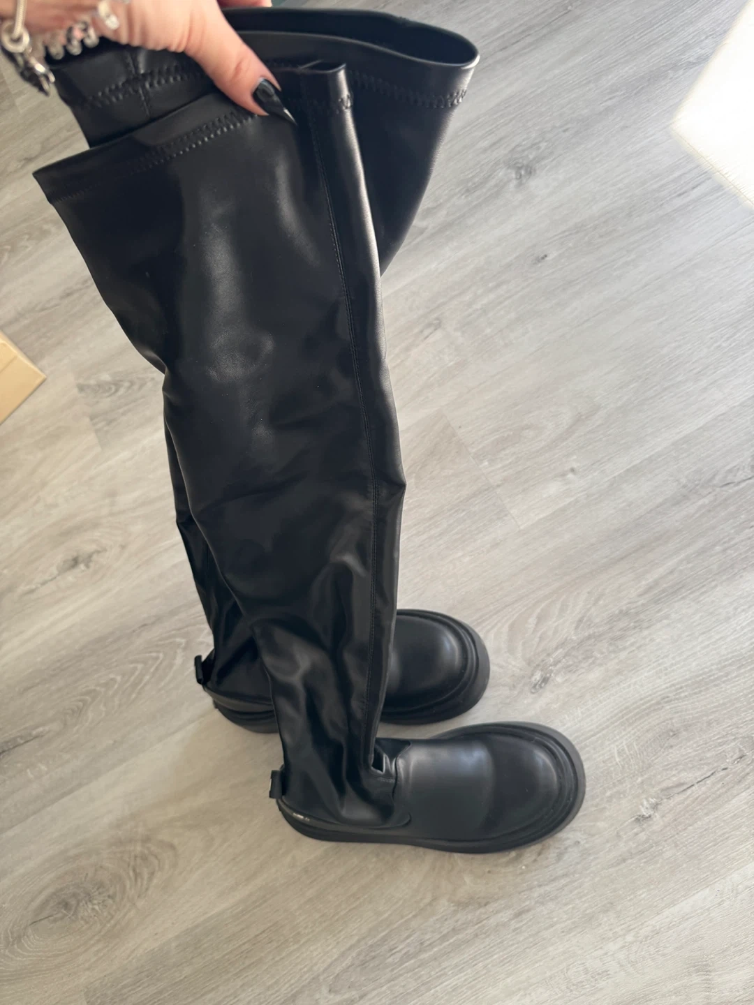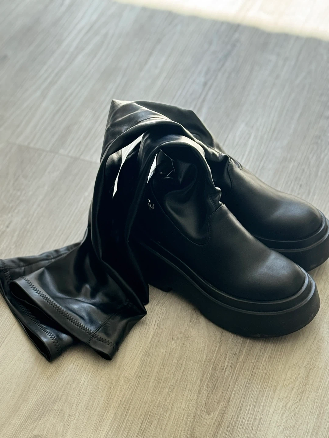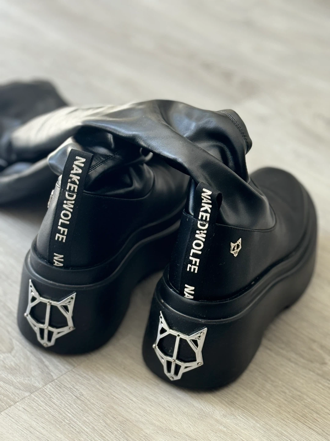Selling a pair of Naked Wolfe over-the-knee boots in black leather. They're in great shape and ready for a new home! The platform sole gives you a little extra height, and the leather is super stylish. Perfect for fall and winter!