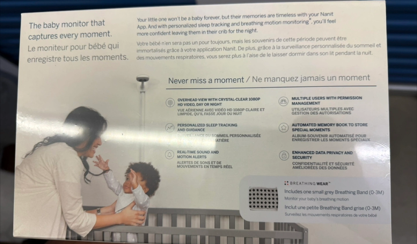 Selling a Nanit Pro HD nursery camera with sleep tracking and breathing motion monitoring! It offers an overhead view with crystal-clear 1080p HD video, plus sleep tracking and guidance to help you understand your baby's sleep patterns. It also includes one small Breathing Band. The camera features smart sound and motion notifications, two-way audio, and the ability to view from anywhere. Comes with the box!