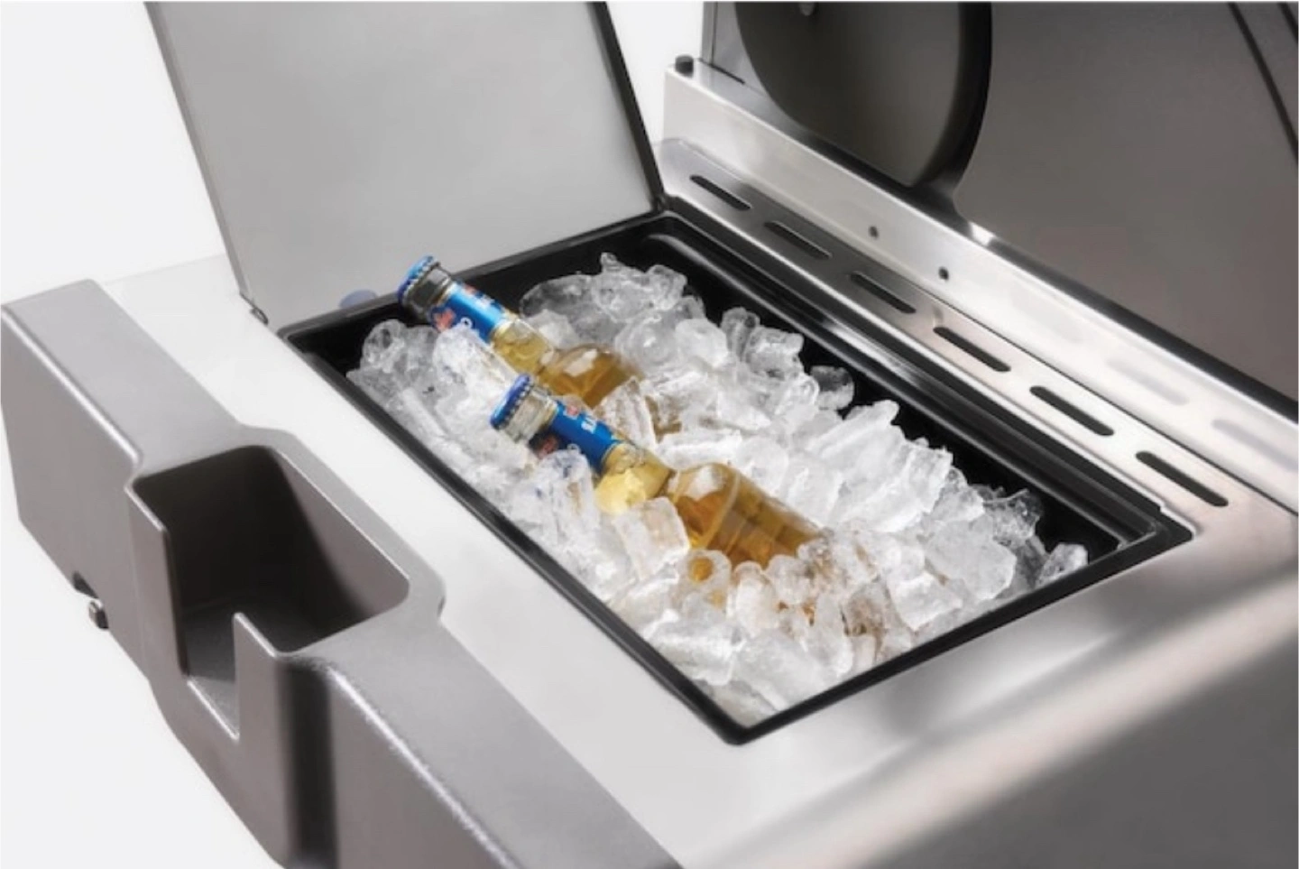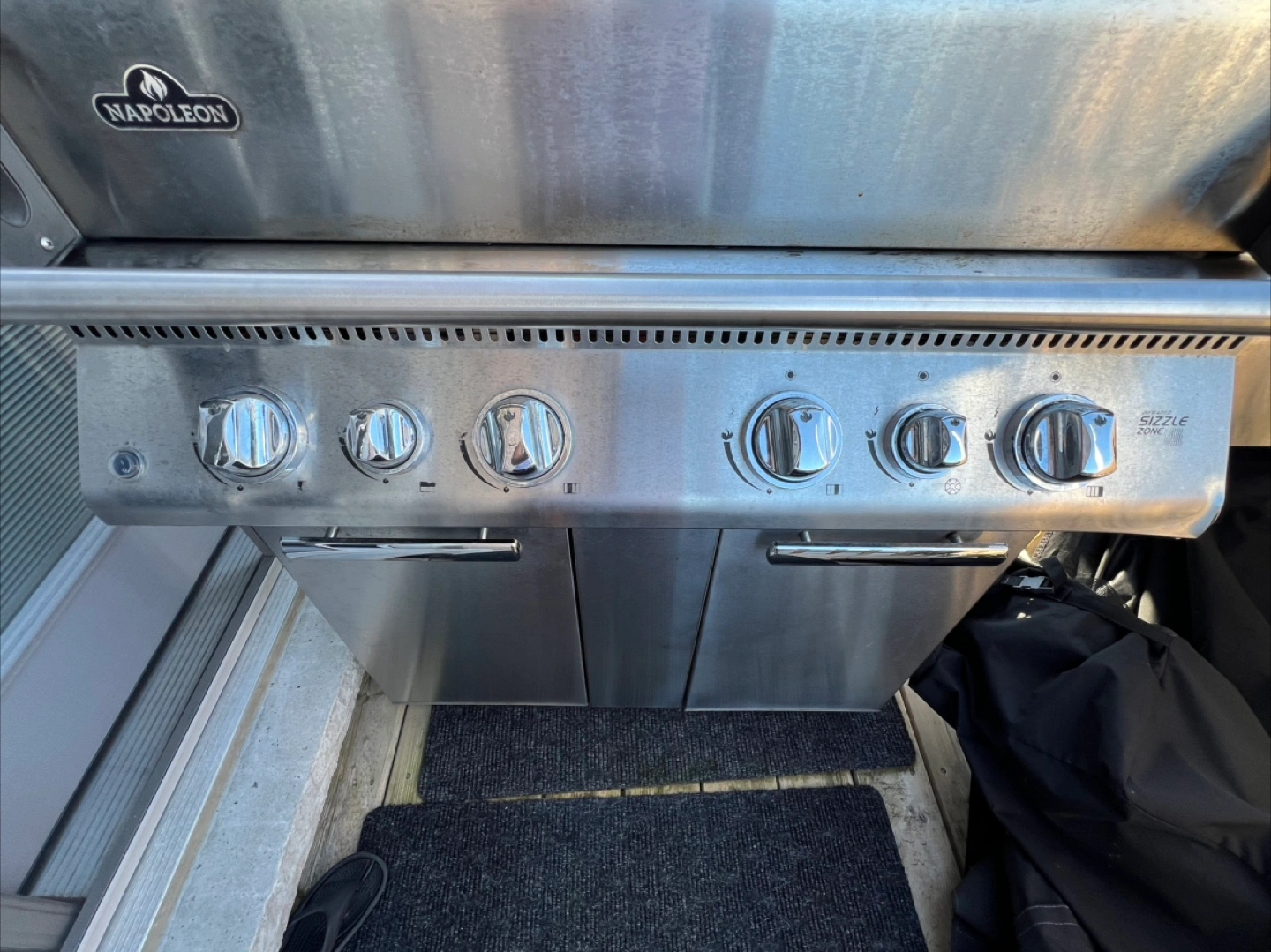 Napoleon LEX Natural Gas grill and protective/winterized cover. It comes with a side burner, and on the other side a built-in cutting board and ice bucket, perfect for keeping your drinks cold while you grill up a storm. It's a great addition to any outdoor space!