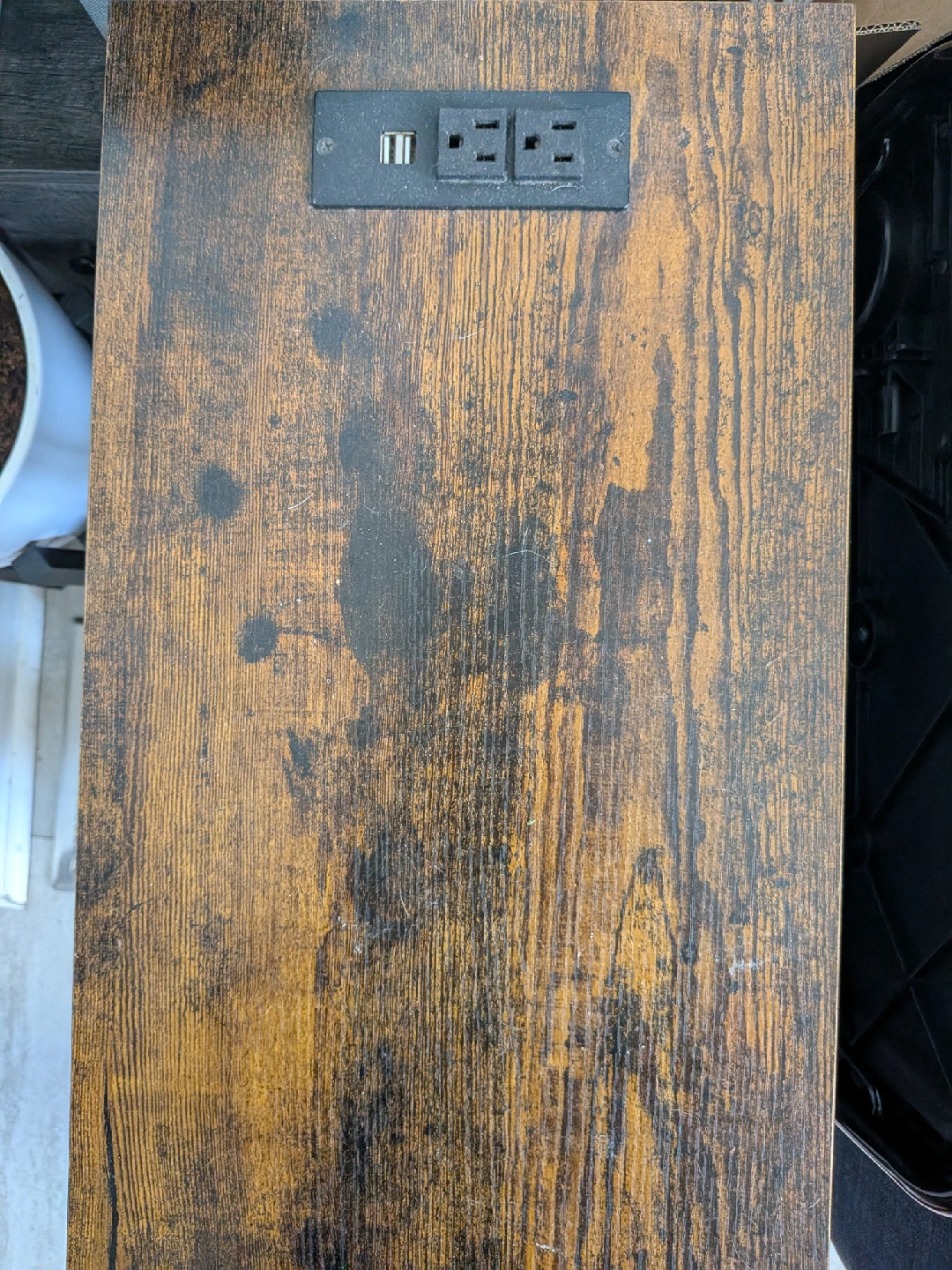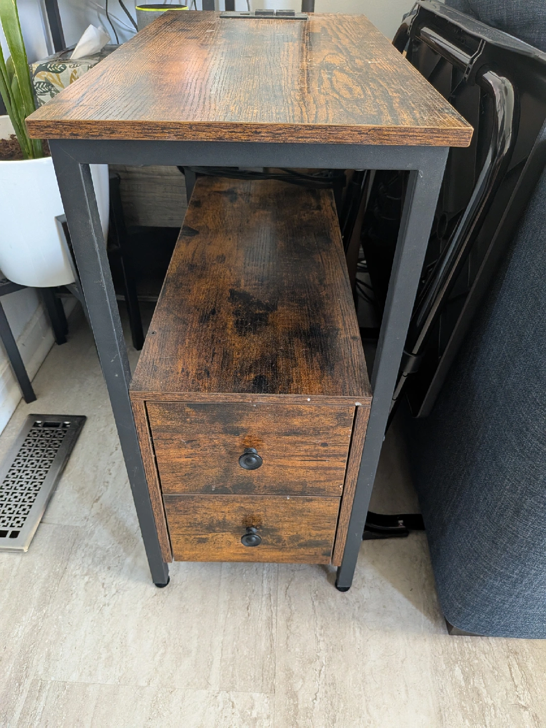 This VASAGLE narrow end table is perfect for small spaces. It features a built-in charging station with USB ports and outlets, so you can easily charge your devices. There are also two drawers for storage. The table is made of wood and metal, and it has a rustic brown finish.