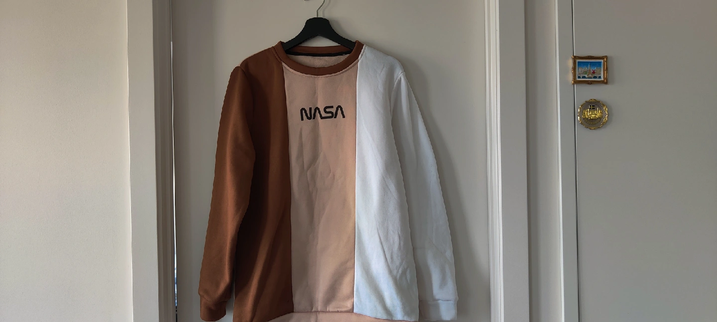 Selling a NASA colour block sweatshirt, perfect for adding a touch of space exploration to your wardrobe! It features a unique colour block design with the NASA logo prominently displayed. Great for casual wear or layering on cooler days