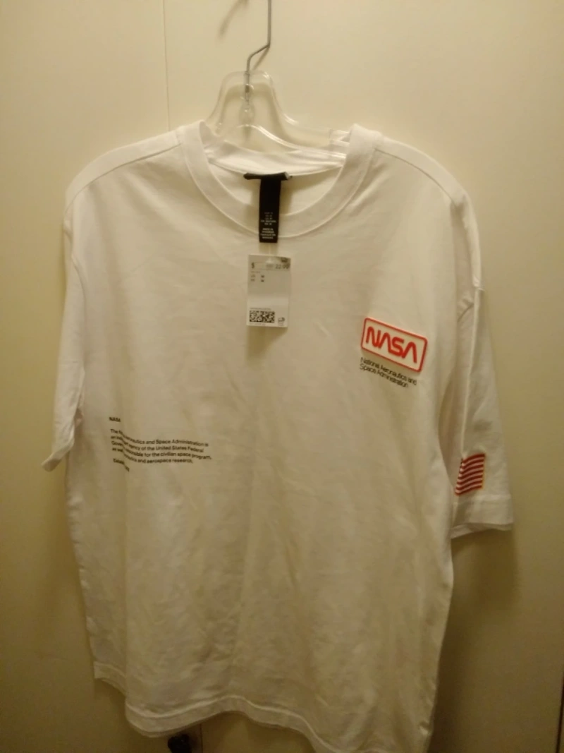 White NASA t-shirt with a patch on the sleeve and NASA text on the back. Size M.
