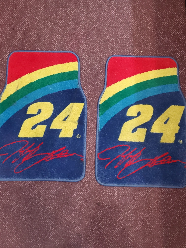 A pair of NASCAR #24 Jeff Gordon car floor mats. They feature a colourful rainbow design with the number 24 and Jeff Gordon's signature. Perfect for any NASCAR fan!