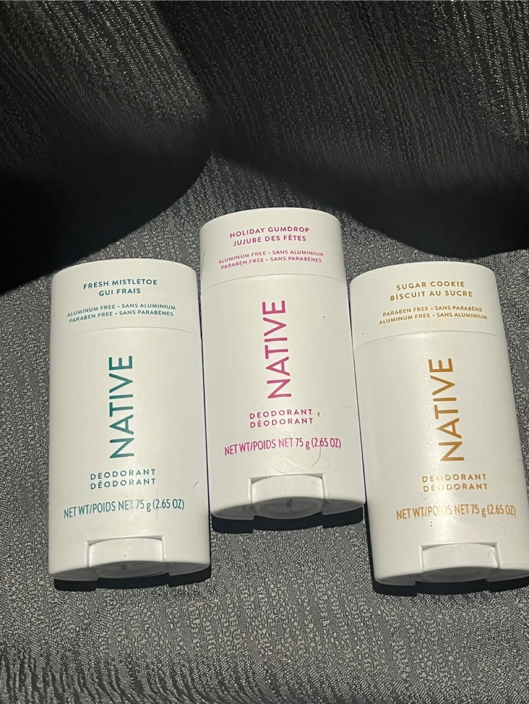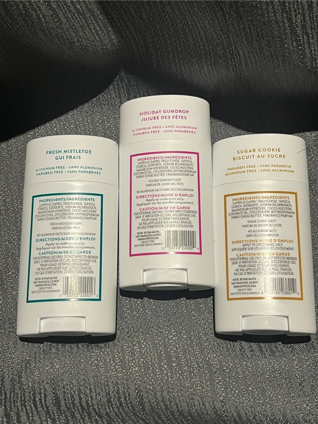 Selling a bundle of three Native deodorants! You'll get Fresh Mistletoe, Holiday Gumdrop, and Sugar Cookie scents. All are aluminum-free and paraben-free. Net weight is 75 g (2.65 oz) each. Perfect for trying out new scents or stocking up on your favourites