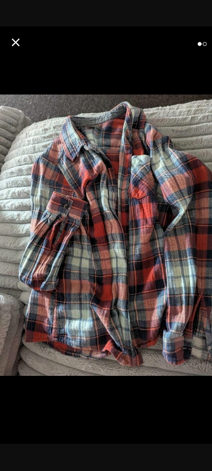 Here's a cozy flannel shirt from Natural Reflections! It features a classic plaid pattern with red, blue, and white. It's a size small and perfect for layering or wearing on its own