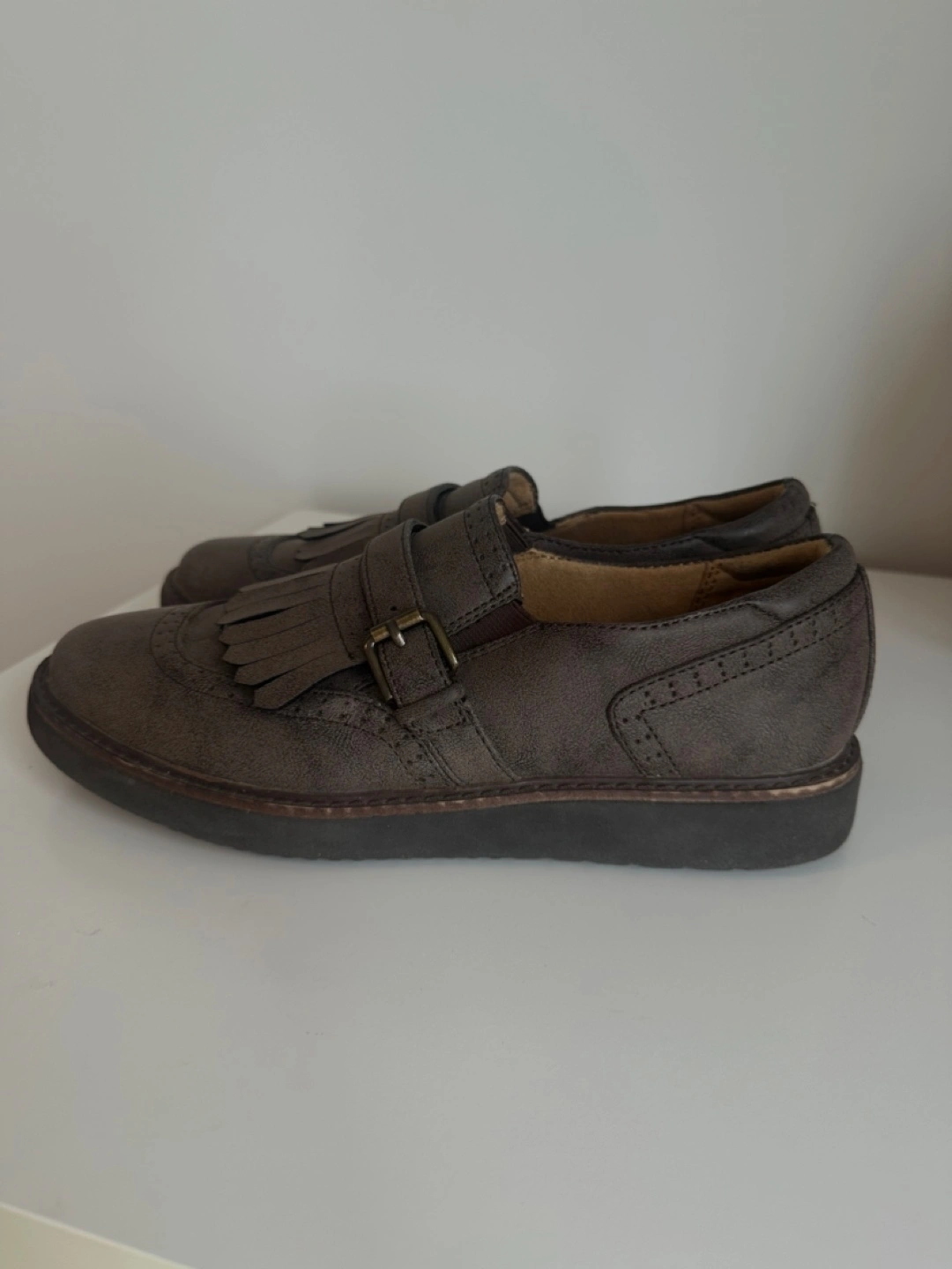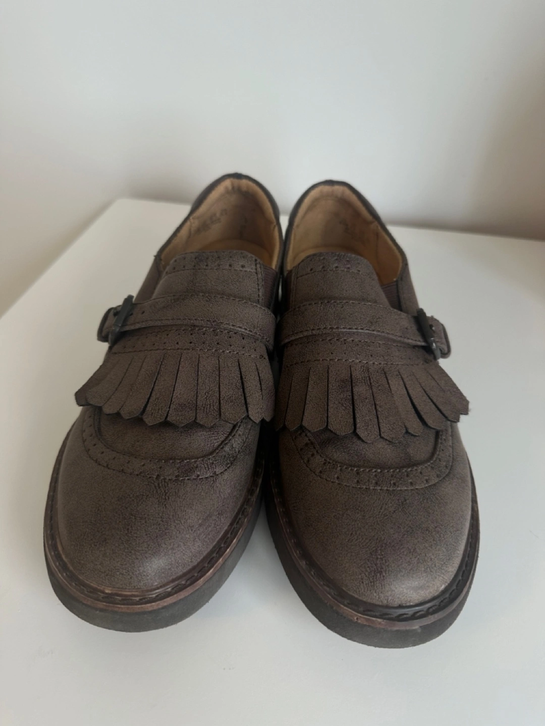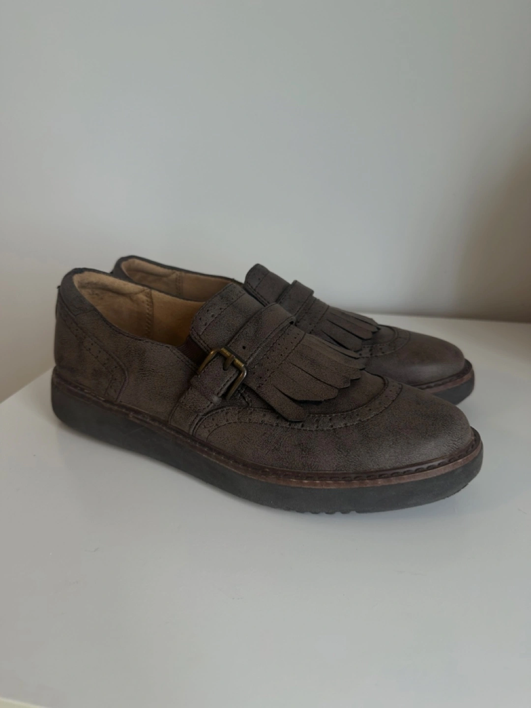 Dark brown loafers. Fringe detail and buckle accent. Platform sole. Slip-on style. Size 8,5. Pick up only!