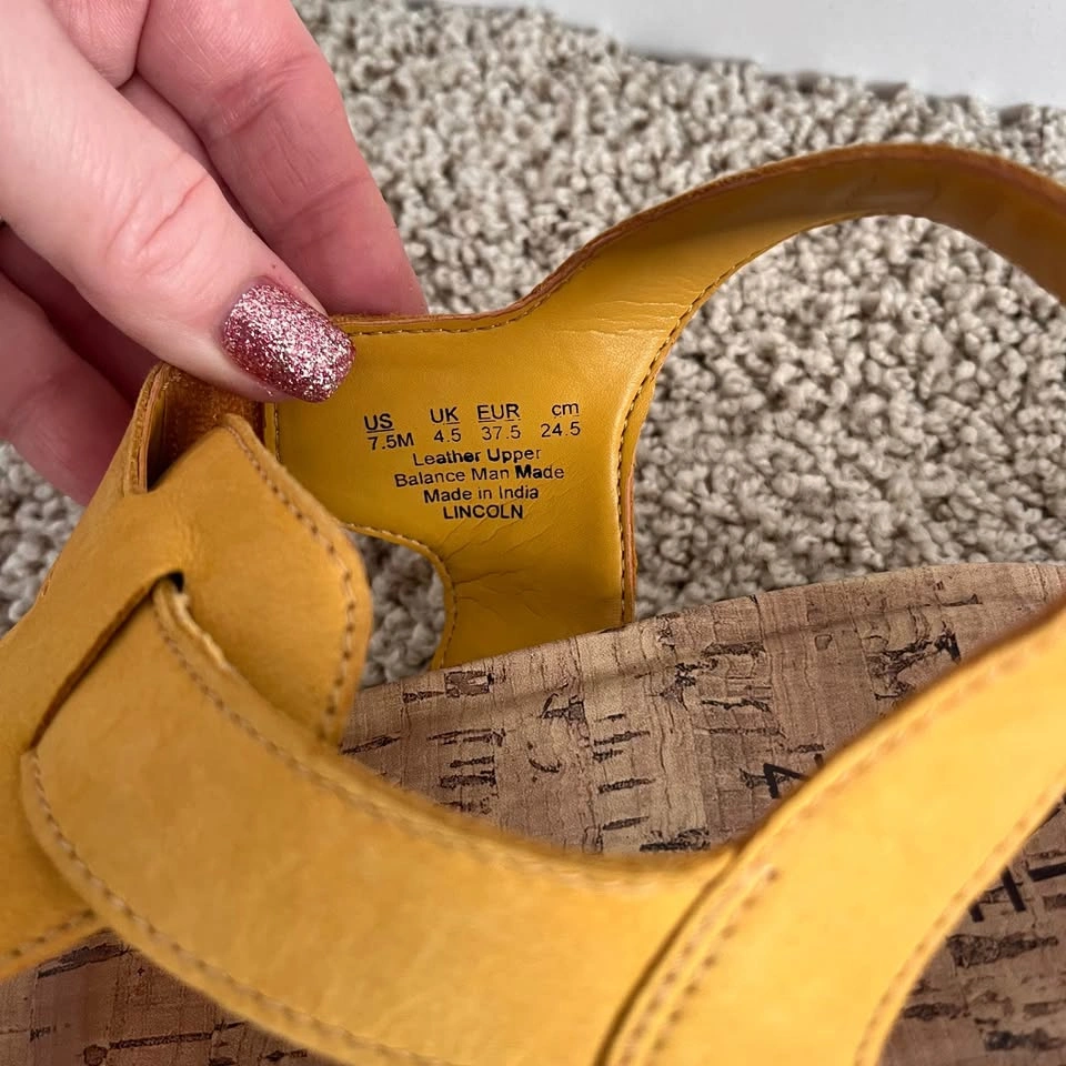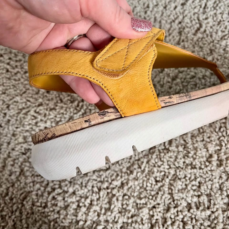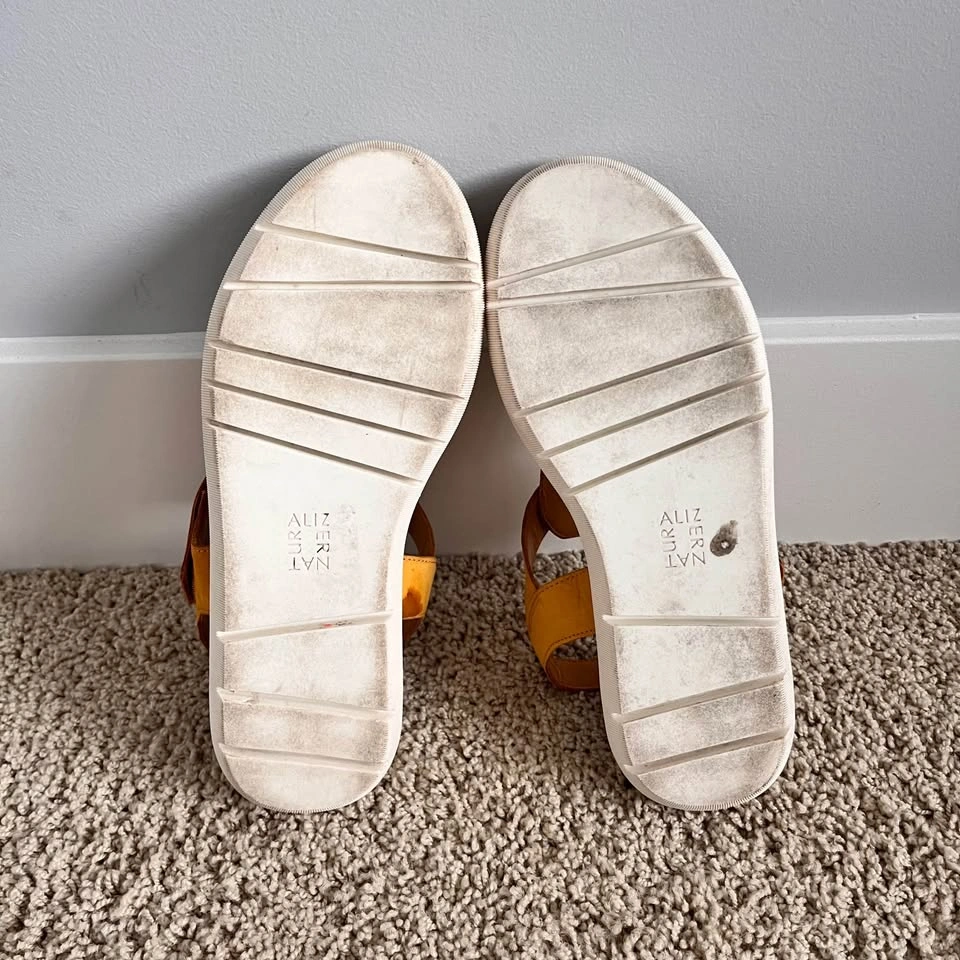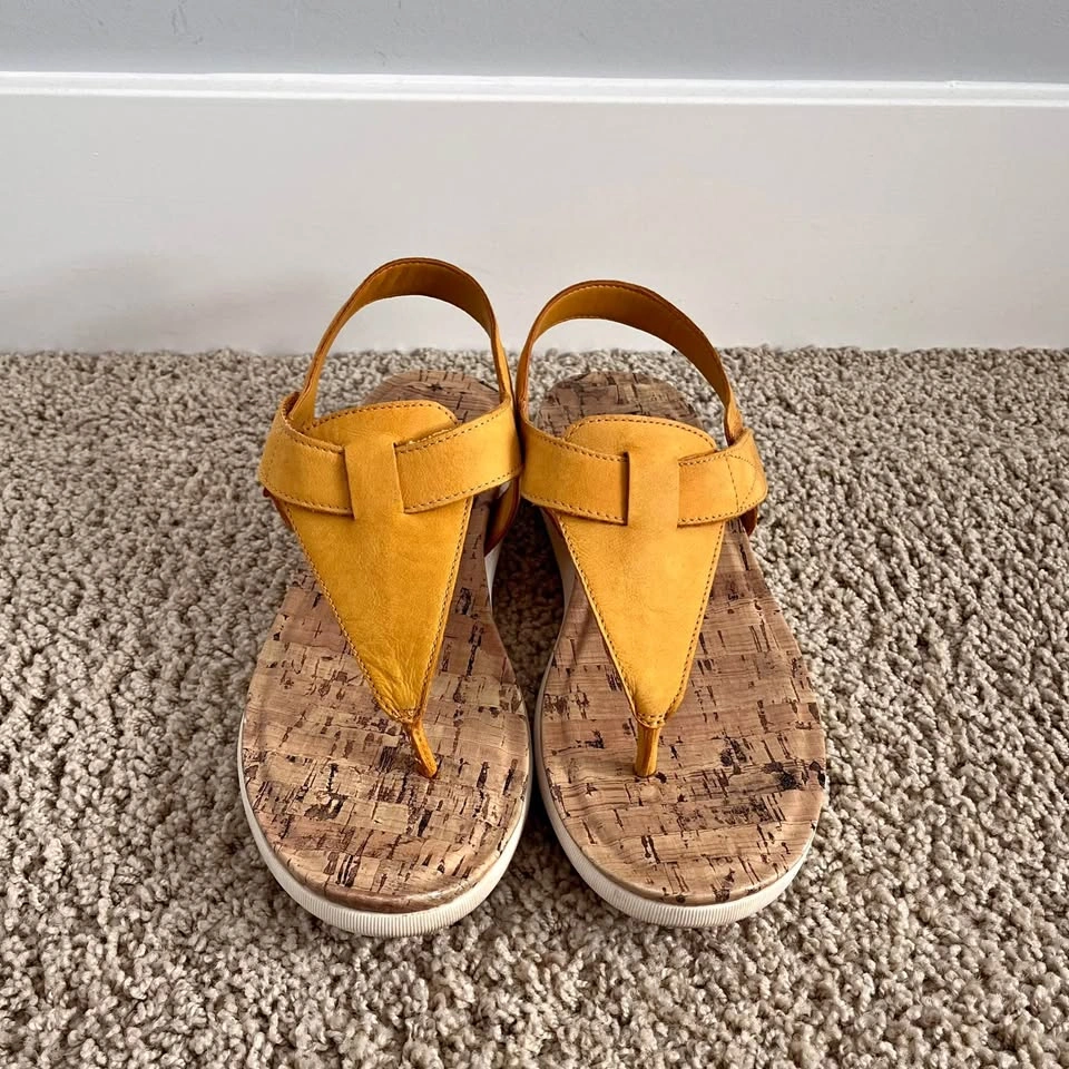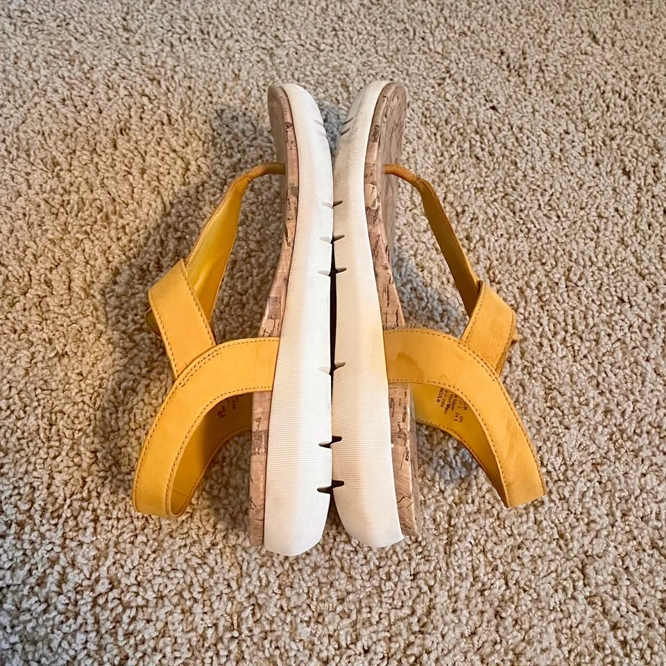 Naturalizer sunset gold thong style sandals with hook and loop velcro adjustable strap. A cloud-like sport flex sole keeps you walking on air in this simple sandal with a sporty-chic design and T-bar detail secured by an adjustable ankle strap. Overall good condition however there is a couple of spots where some rubbing alcohol got on the leather and left a mark (looks like watermarks) as shown in the photos. Velcro is in great condition; still lots of life left in these beauties! Women's Size 7.5 100% Leather upper - Leather upper with an open toe Contour+ technology for a premium fit and all-day comfort experience - Adjustable hook-and-loop strap - Non-slip rubber outsole with flex grooves - Comfortable faux cork insole - 1 1/2" heel Porch pick up west Maple Ridge.