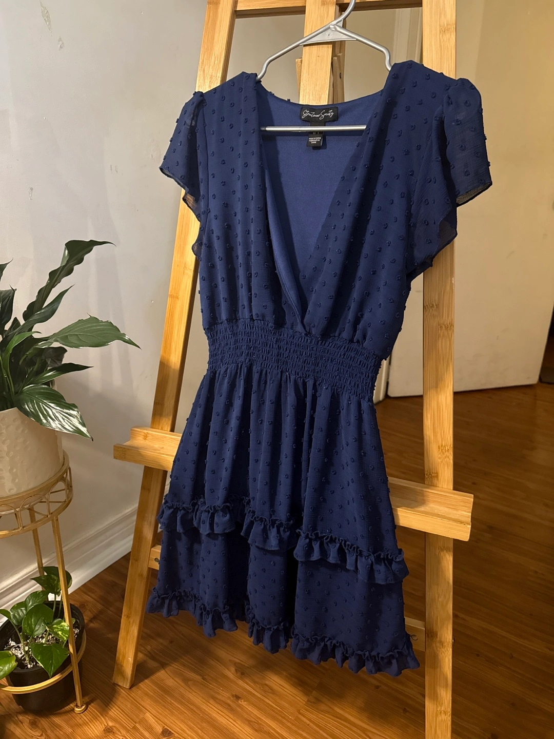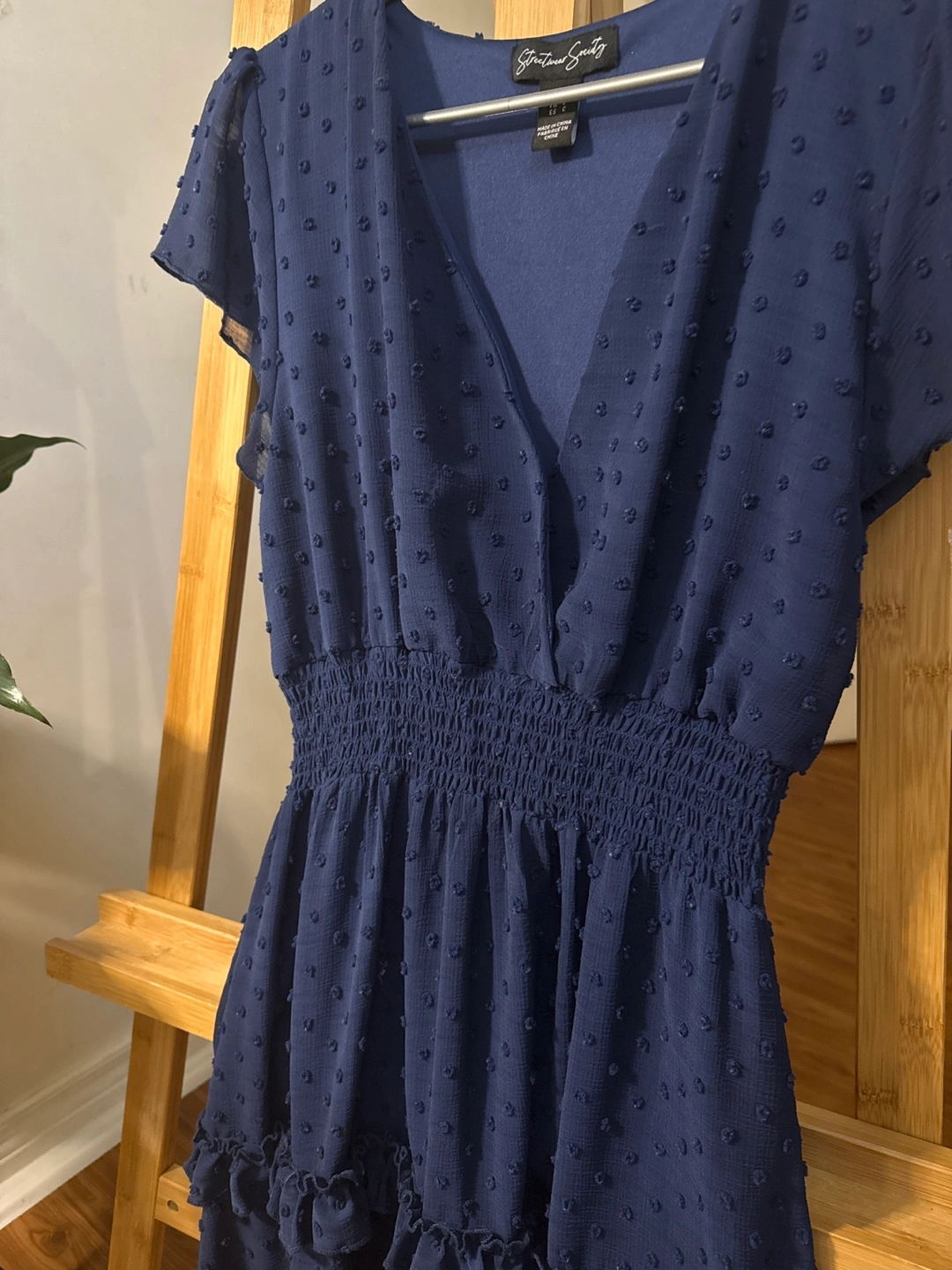 A beautiful navy blue dress. Features short sleeves and a v-neckline. Elasticated waist and ruffled hem. Perfect for a summer day out, bringing a sense of comfort.