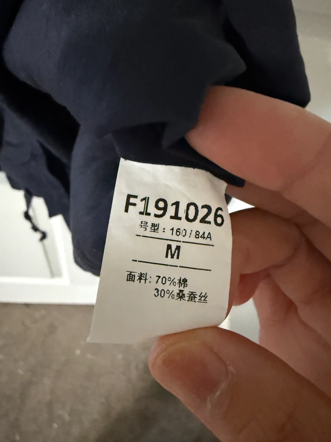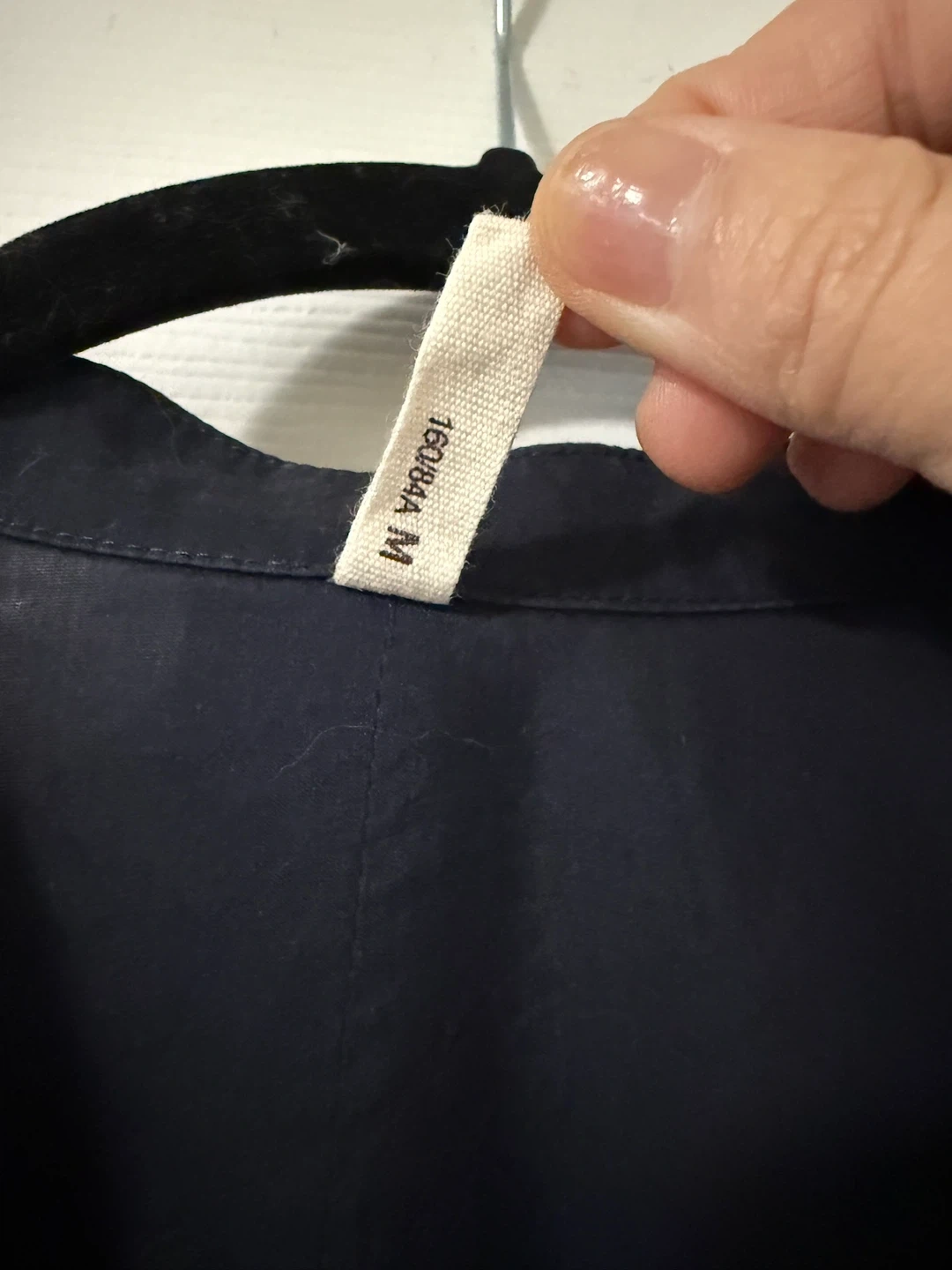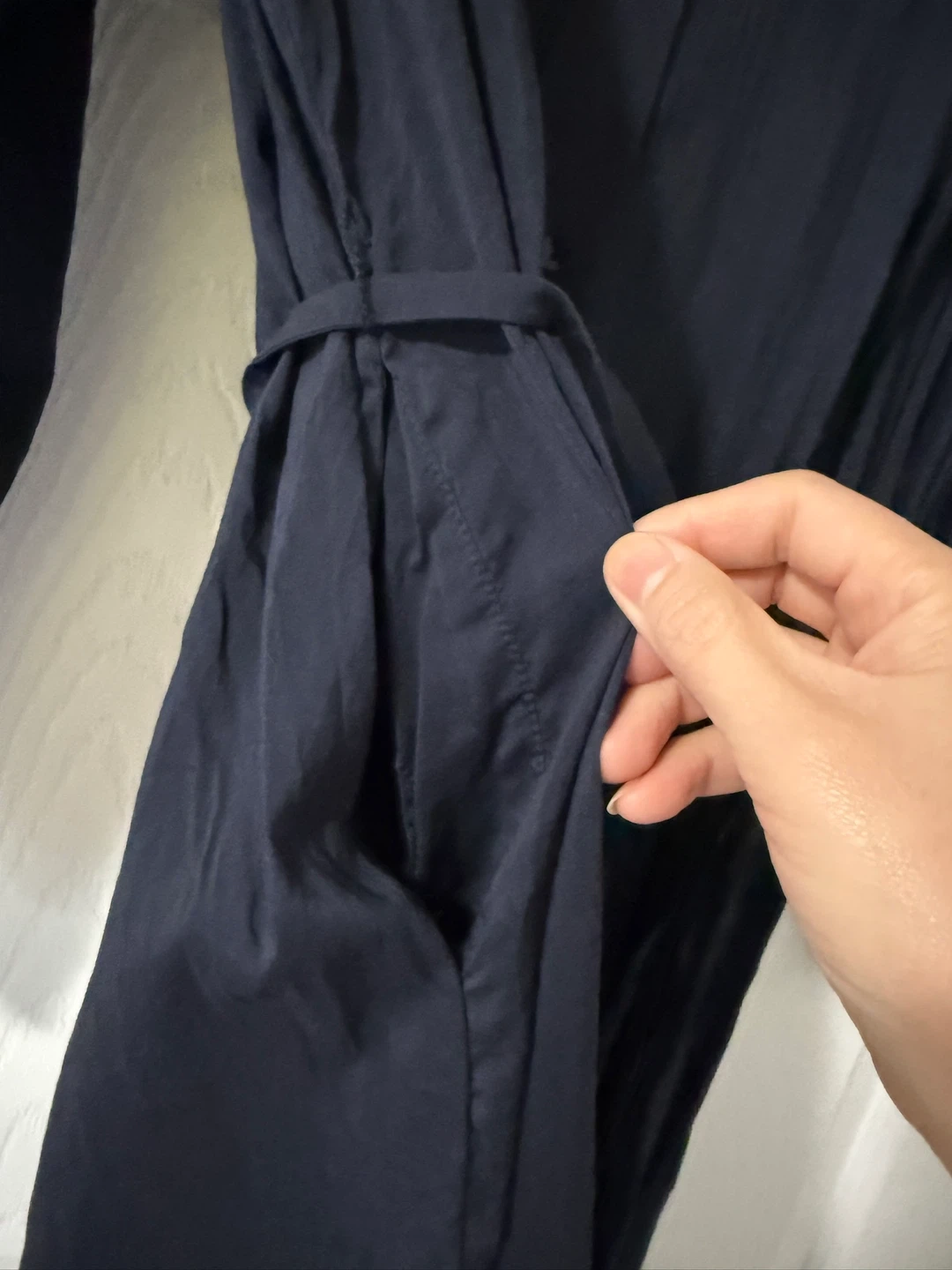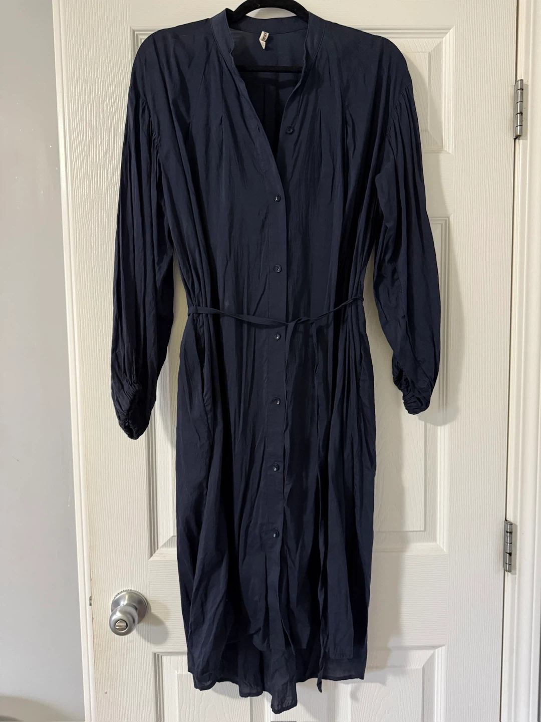A lovely navy blue dress in size medium. It features a button-down front and a tie at the waist. The material is a blend of 70% cotton and 30% silk, making it comfortable and breathable. Perfect for any occasion!