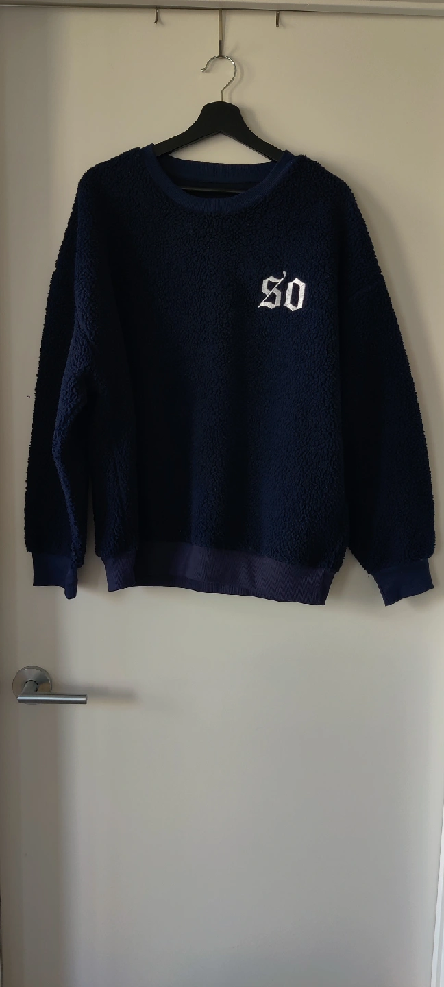 Selling a cozy navy blue fleece sweatshirt. It has the letters 'SO' embroidered on the front. It's in great condition and super comfy for chilly days