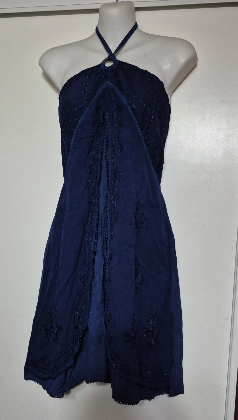 This is a cute halter dress in a navy blue colour. It features an embroidered design. Perfect for summer!