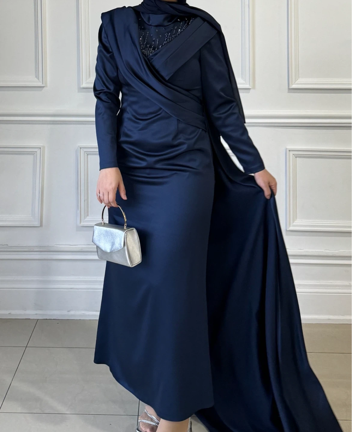 Beautiful navy blue formal dress! Perfect for special occasions. The dress features long sleeves and an elegant design. It's in great condition and ready for a new home