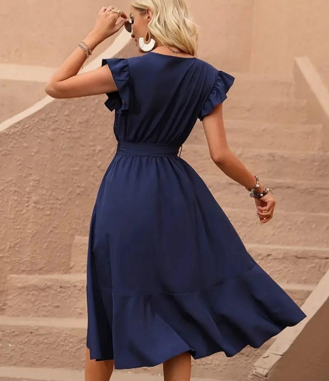 This navy blue ruffle wrap dress is perfect for any occasion! It's a size medium and features a flattering wrap design with cute ruffle detailing. The dress is made of a lightweight material, making it comfortable to wear all day long. It's in never been worn