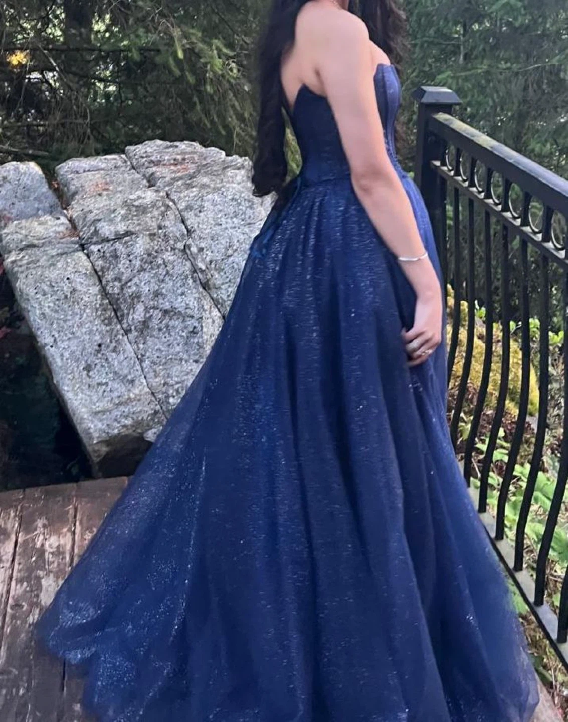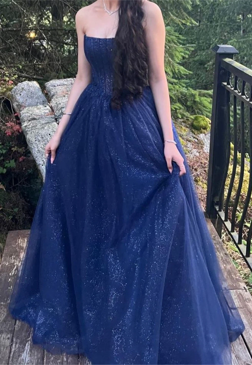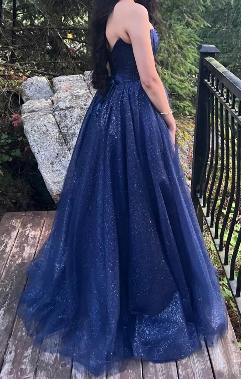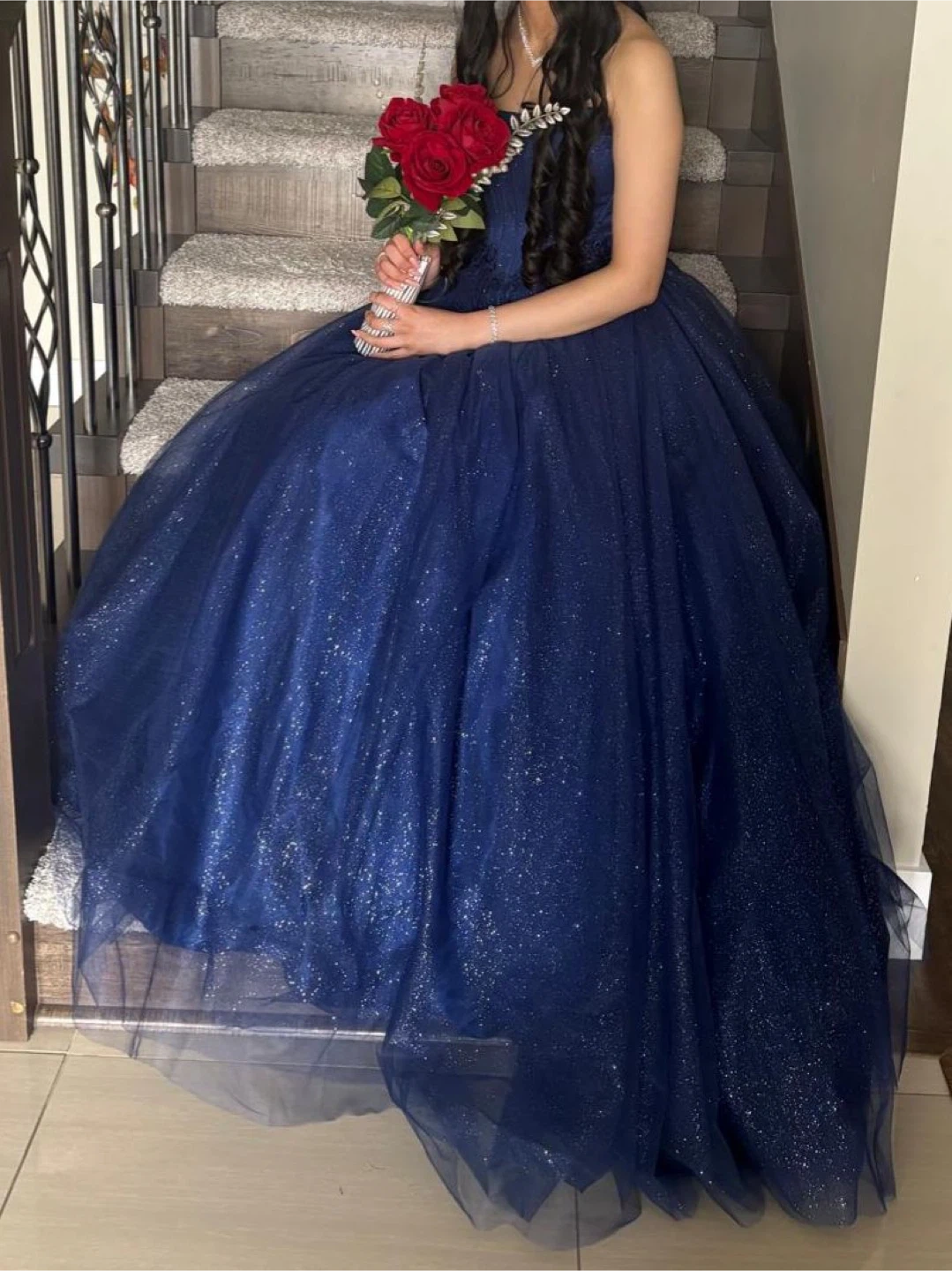 Beautiful navy blue gown with a corset top. It has a sparkly, glittery effect throughout the dress. Perfect for prom or any special occasion!
