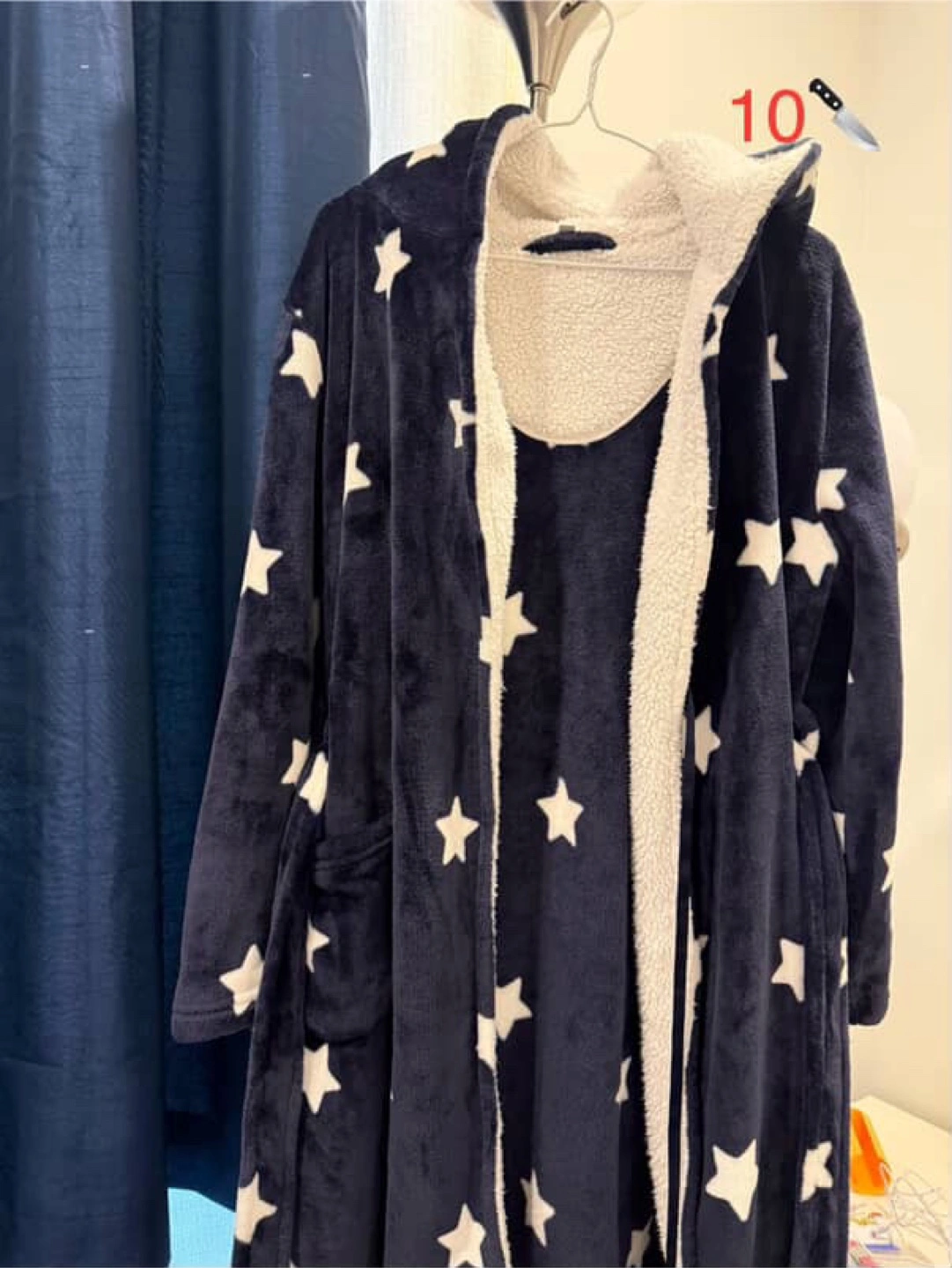 Women's hooded fleece robe. Navy blue with white stars. Soft and cozy. Features pockets and a self-tie belt.