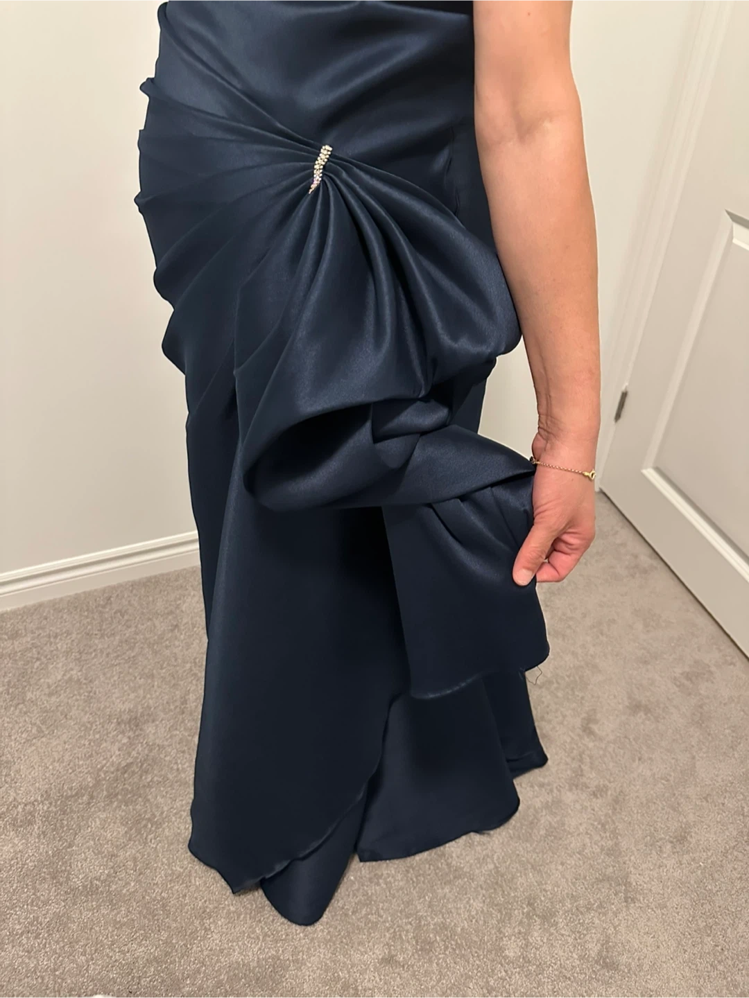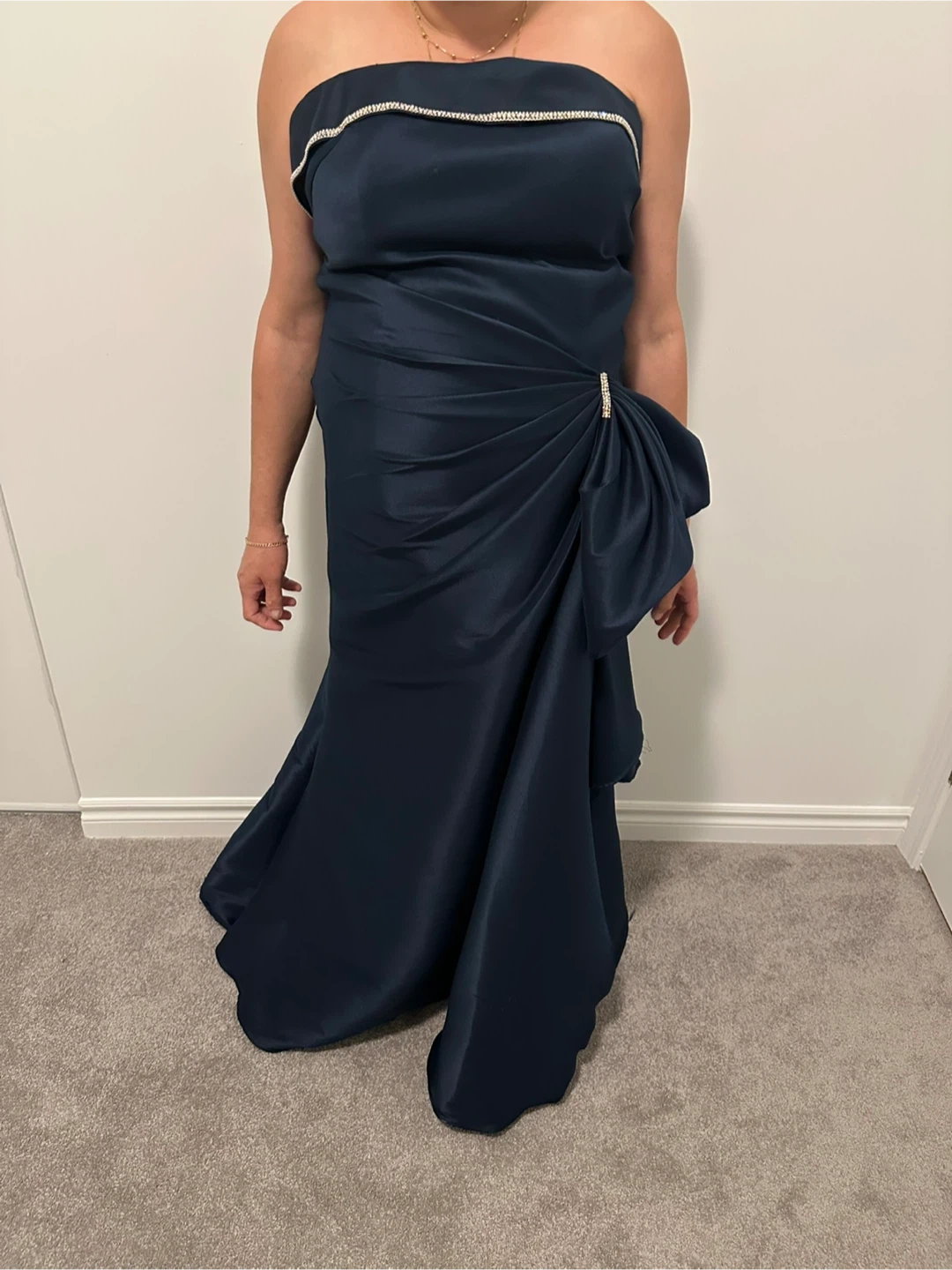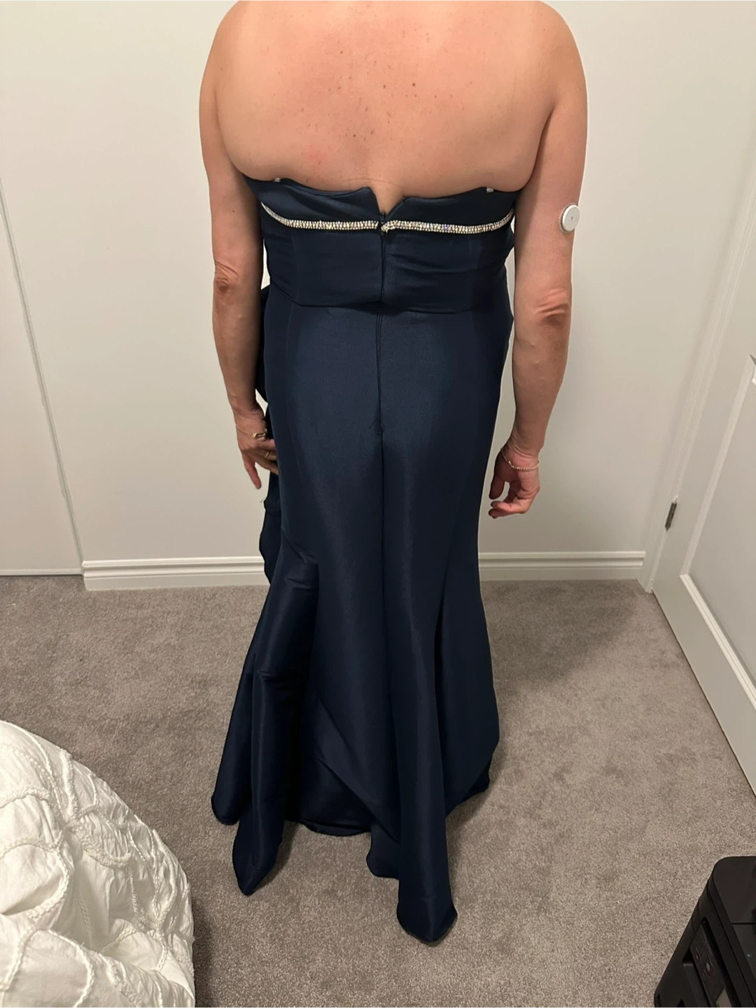 Selling a beautiful navy blue Terani Couture strapless formal dress. It features a unique ruffled design and rhinestone detailing. Perfect for a special occasion!