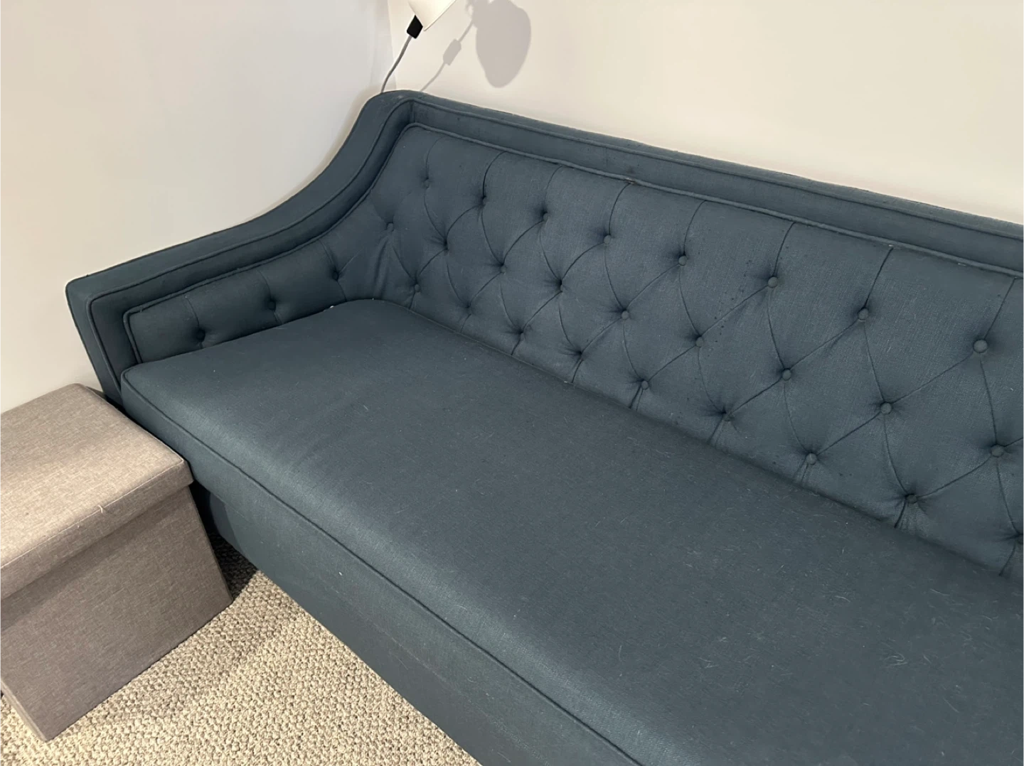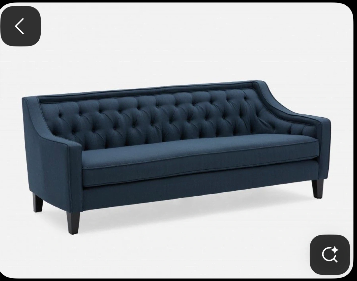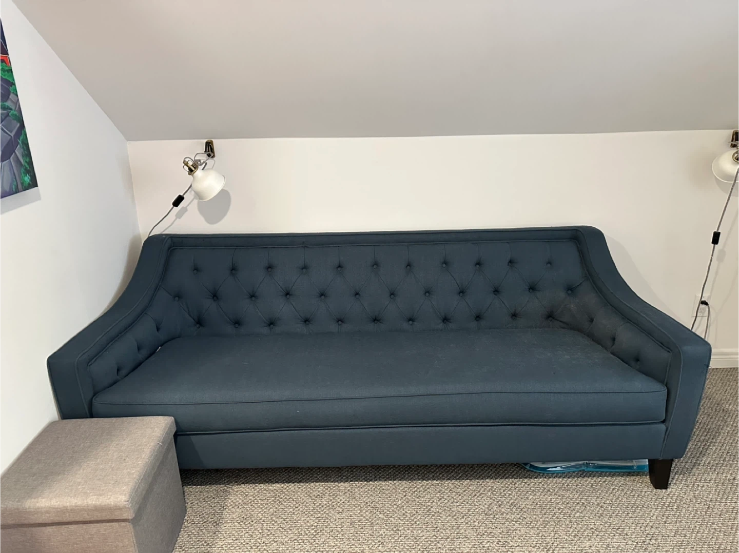 Selling a lovely navy blue tufted sofa! It's in great shape and would be a stylish addition to any living room or den. The tufted design adds a touch of elegance, and the blue colour is quite versatile. It's super comfy too! 3-seater.