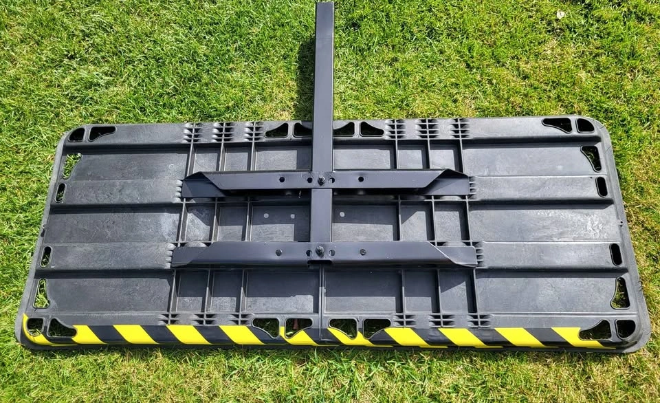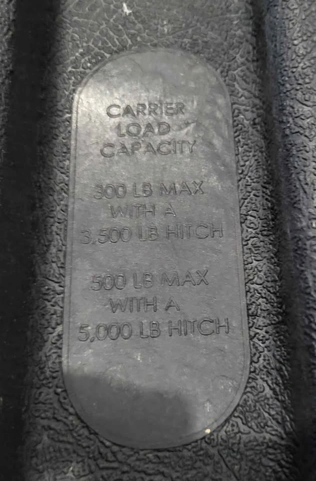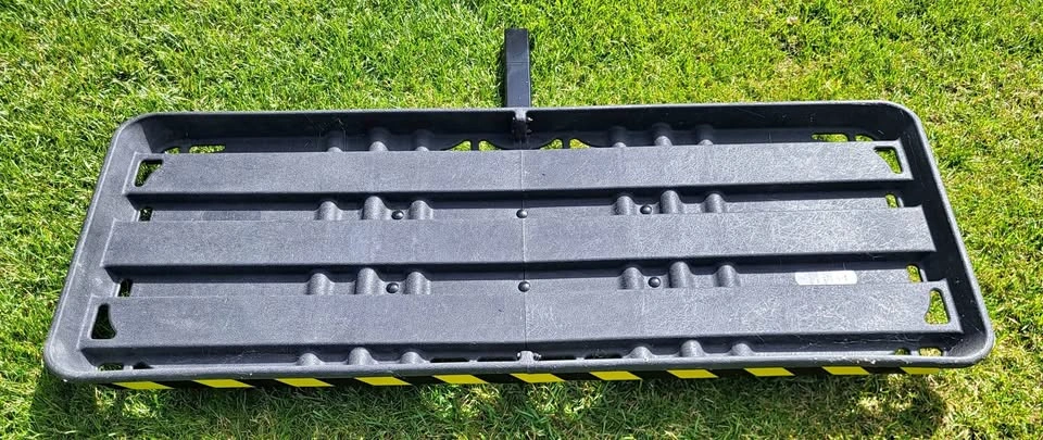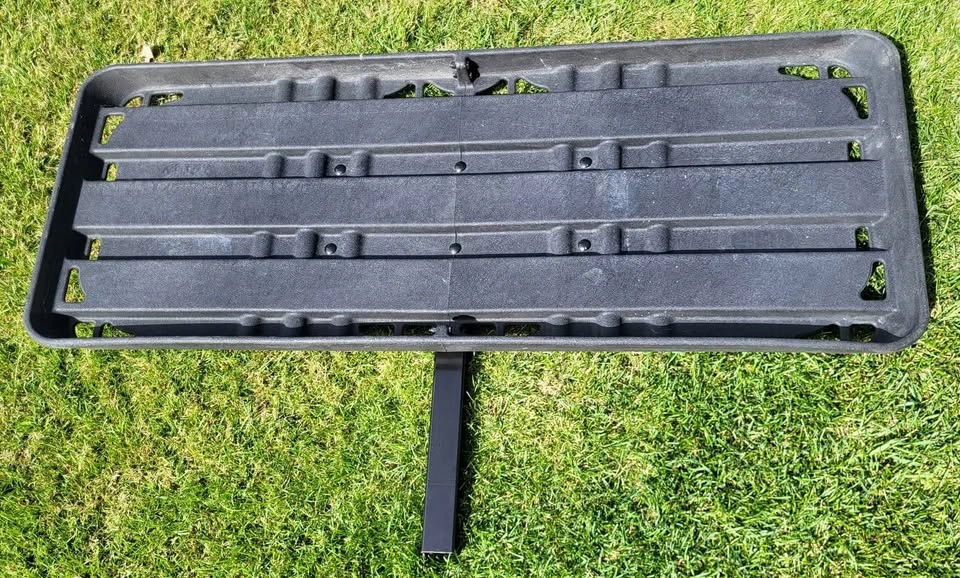 Used once, like new, stored in heated garage, no rust...mint. 43 lbs, 22"w x 56"l x 3" h plus frame underneath. Fits standard 2" receiver. 300lb capacity/ 3500lb hitch, 500lb capacity/ 5000lb hitch. Paid $200.