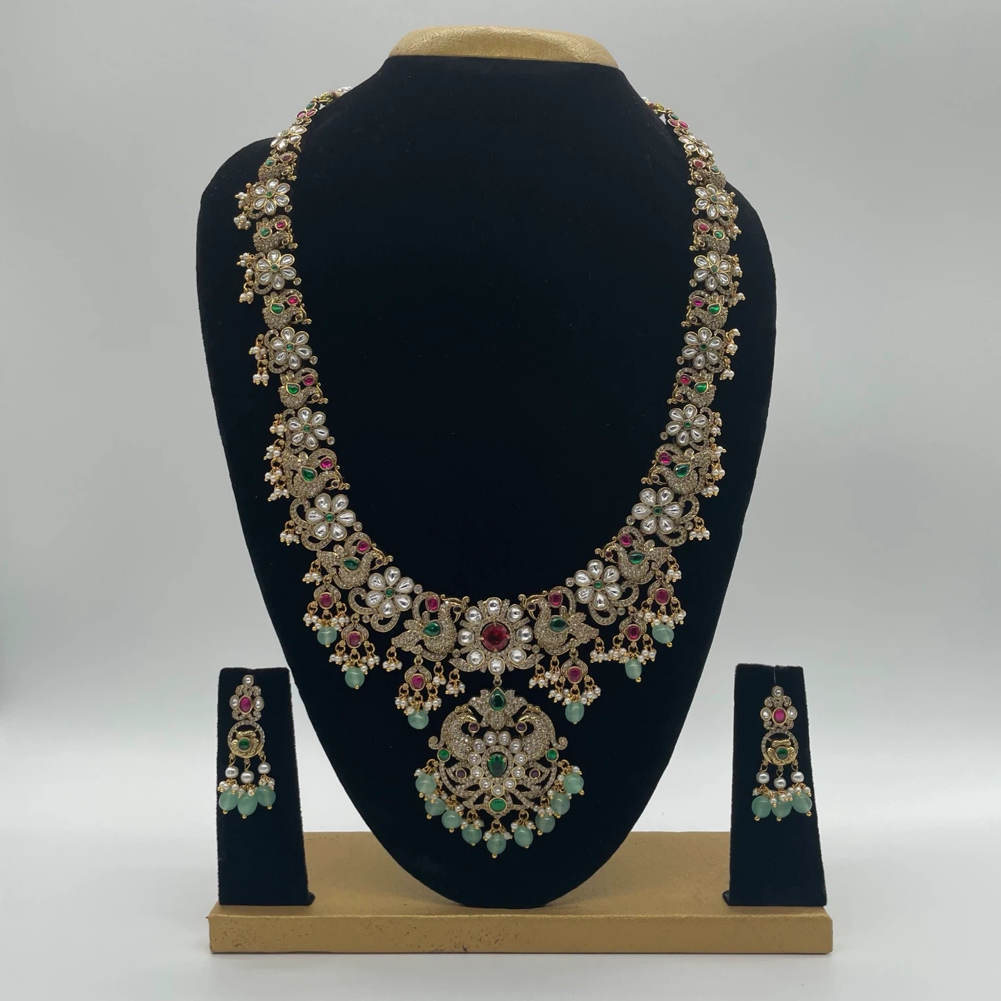 Beautiful necklace and earring set featuring intricate floral designs with red, green, and pearl-like accents. Perfect for adding a touch of elegance to any outfit