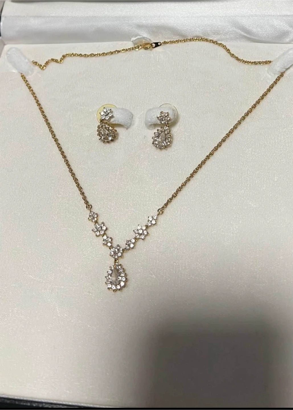 Elegant necklace and earring set in a gold tone. The necklace features a delicate chain with a floral and teardrop pendant design, complemented by matching earrings. Perfect for adding a touch of sparkle to any outfit!