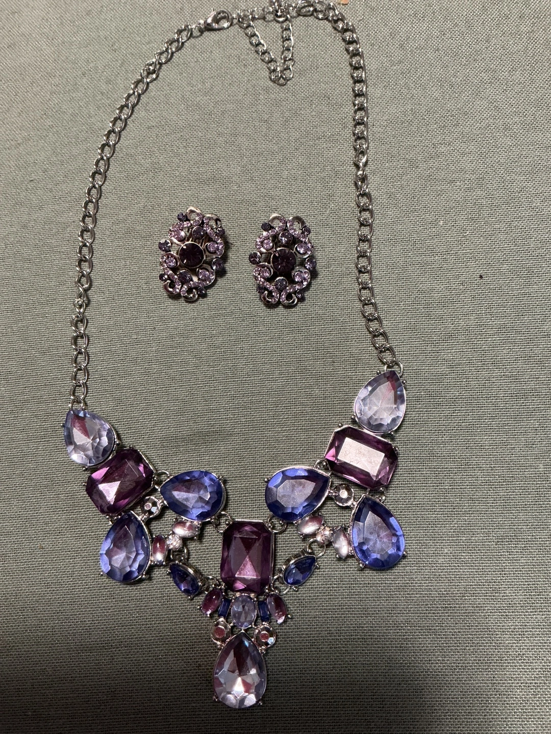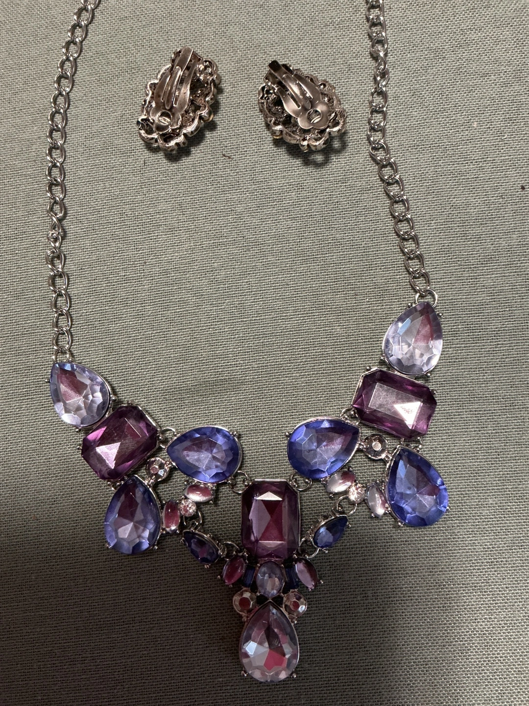 Selling a lovely necklace and earring set! The set features a silver chain and purple-toned gems in various shapes and sizes. The earrings are clip-on style and match the necklace perfectly. This set would be a great addition to any jewelry collection