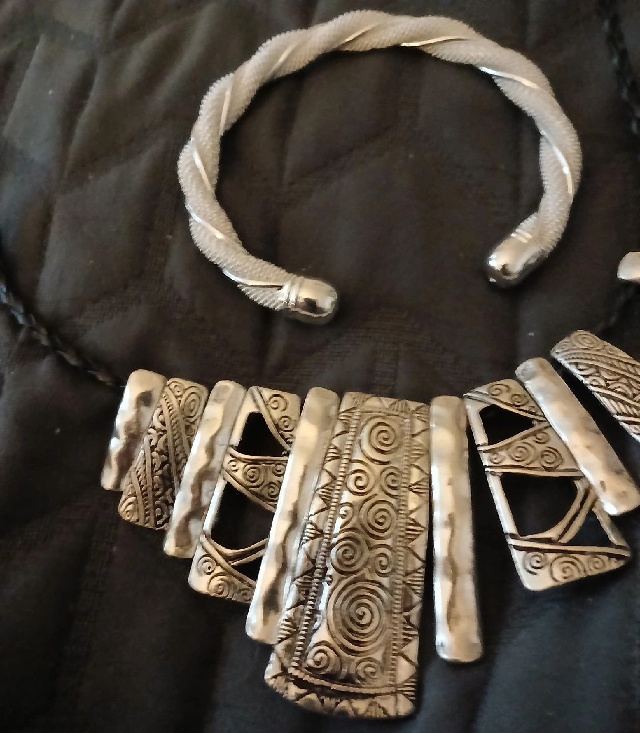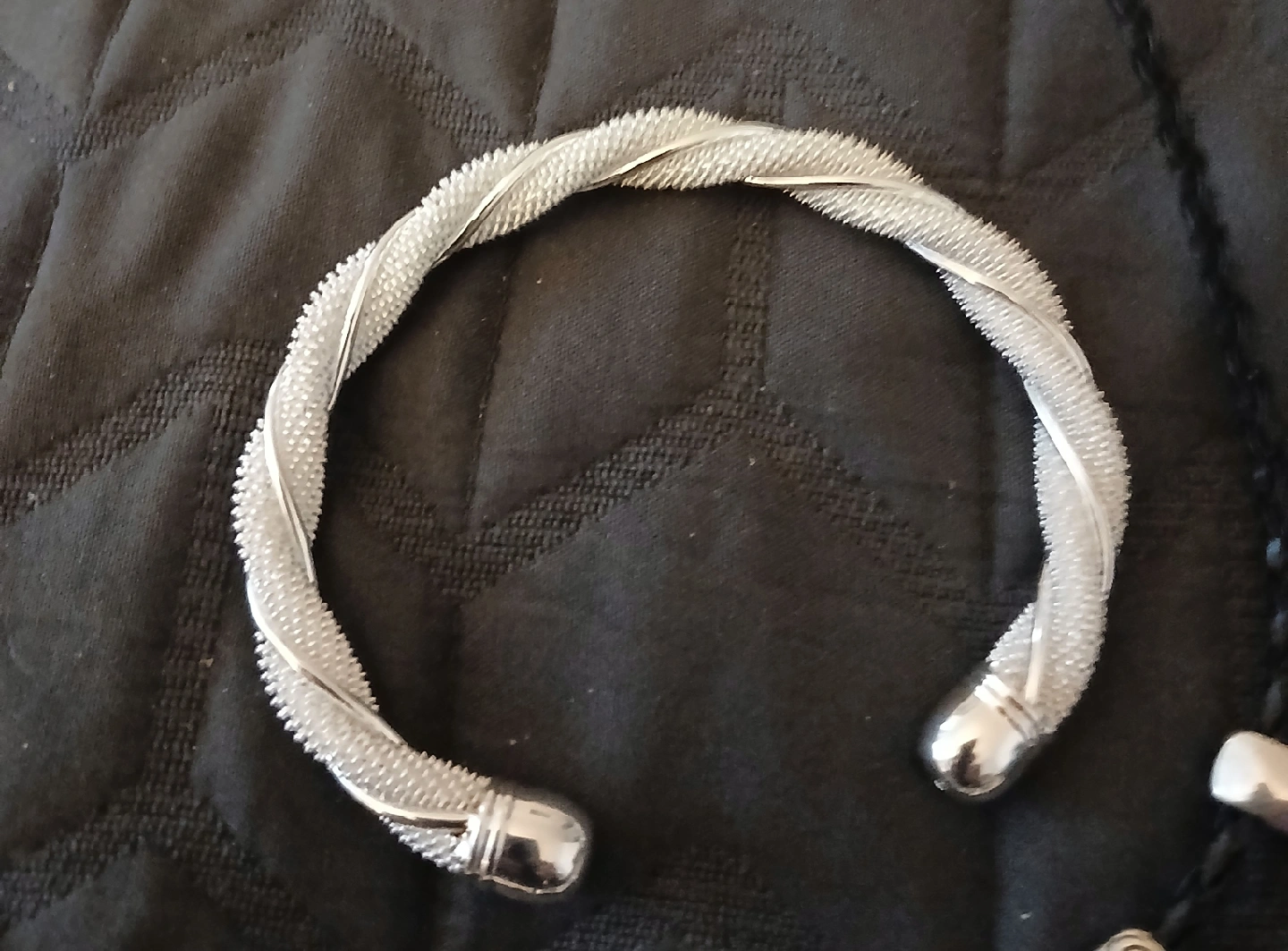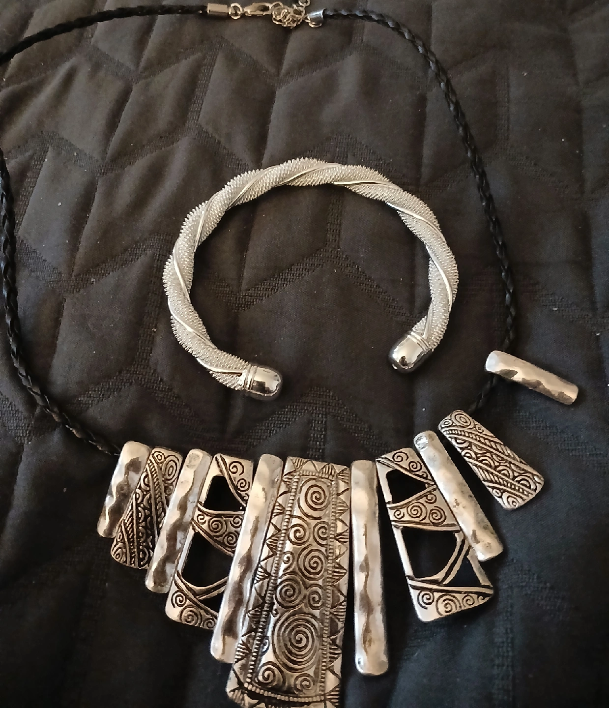 Selling a unique necklace and bracelet set! The necklace has a black cord and silver-coloured pendant. The bracelet is a silver-coloured twisted design. the bracelet is adjustable bundle on other listings and save
