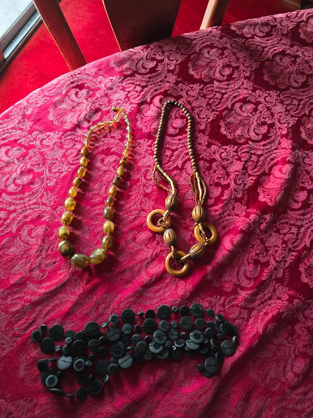 Selling a set of three unique necklaces! There's a strand of black beads, a necklace with wooden accents, and one with pretty amber-coloured beads. They're perfect for adding a touch of style to any outfit