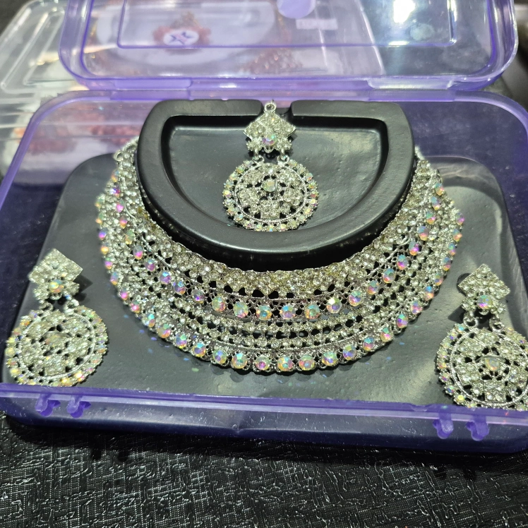 Selling a beautiful set that includes a necklace, earrings, and a headpiece. It's in great condition and comes in a box, perfect for keeping everything together