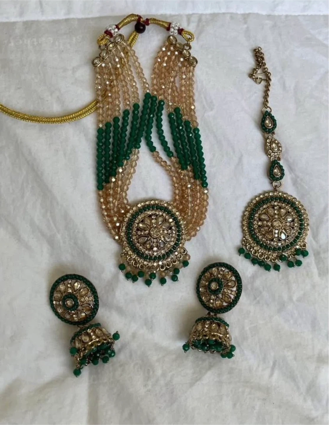 Beautiful matching jewelry set! Includes a beaded necklace, earrings, and a headpiece. The set features a lovely combination of gold and green beads, perfect for adding a touch of elegance to any outfit