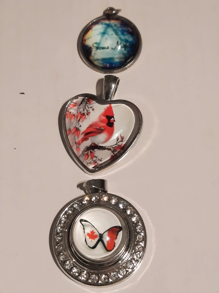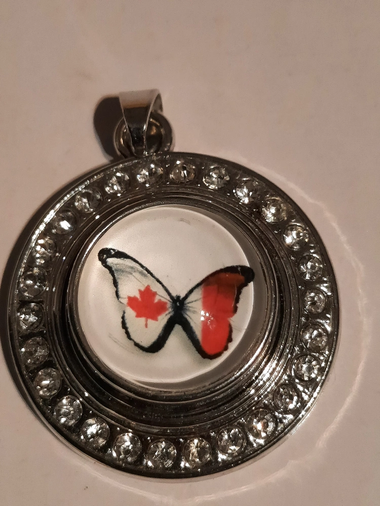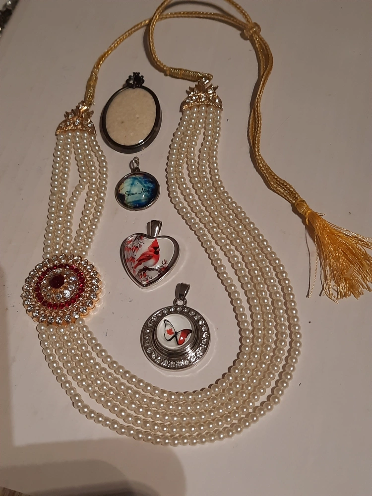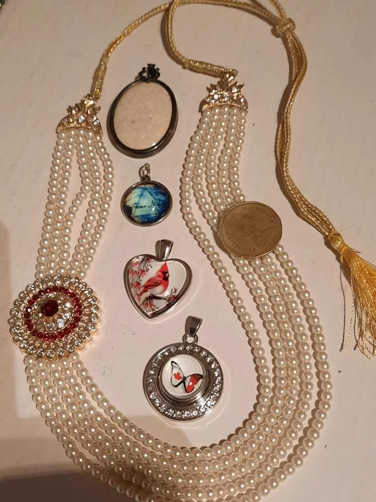 Selling a necklace with multiple pendants. The necklace is a multi-strand pearl design with a gold-coloured rope accent. The pendants include a cardinal, a butterfly with a Canadian flag, and other decorative designs. A unique collection to add to your jewellery box!