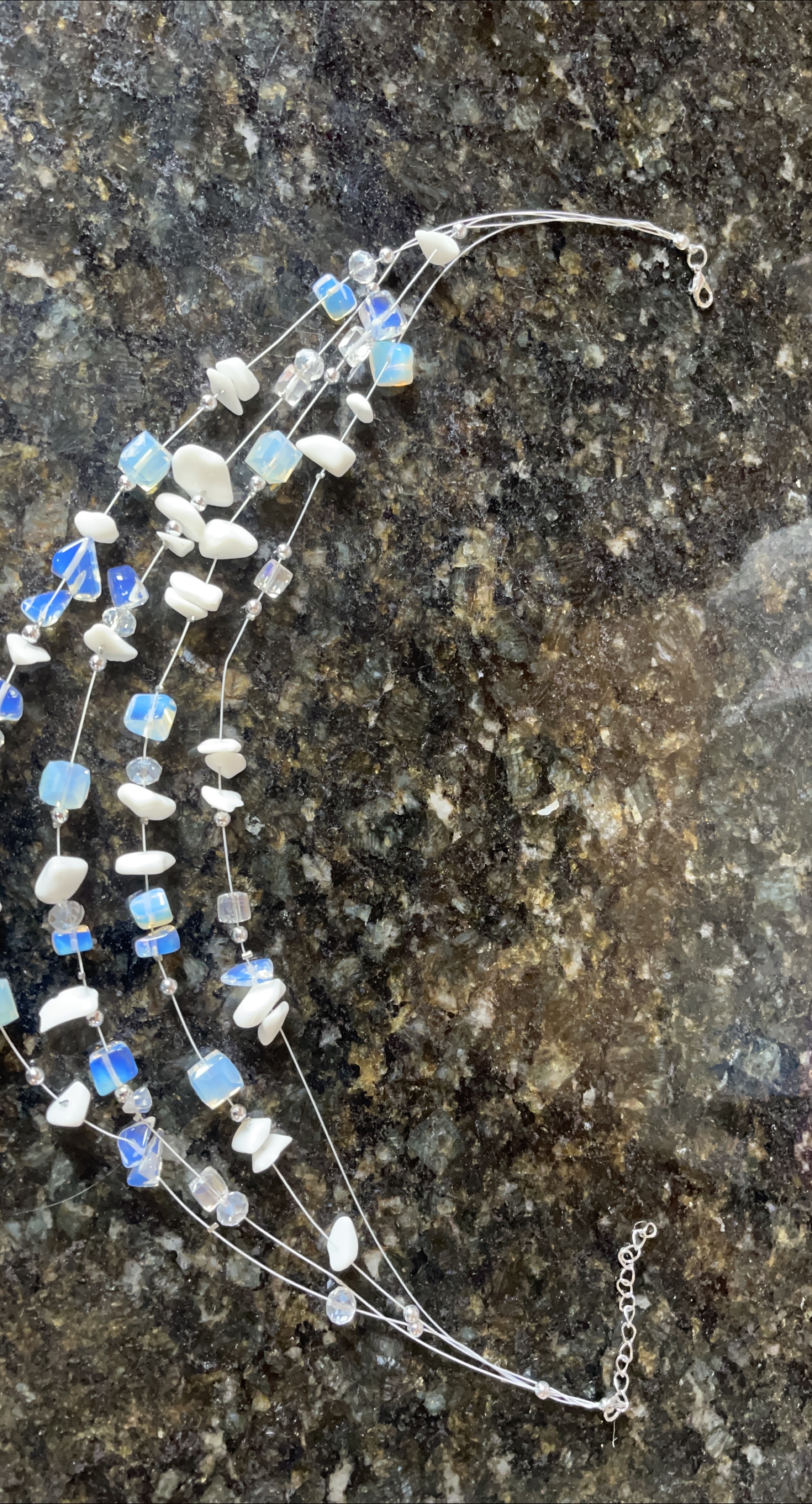 A beautiful multi-strand necklace featuring white and blue beads! It's in great condition and would make a lovely addition to any outfit